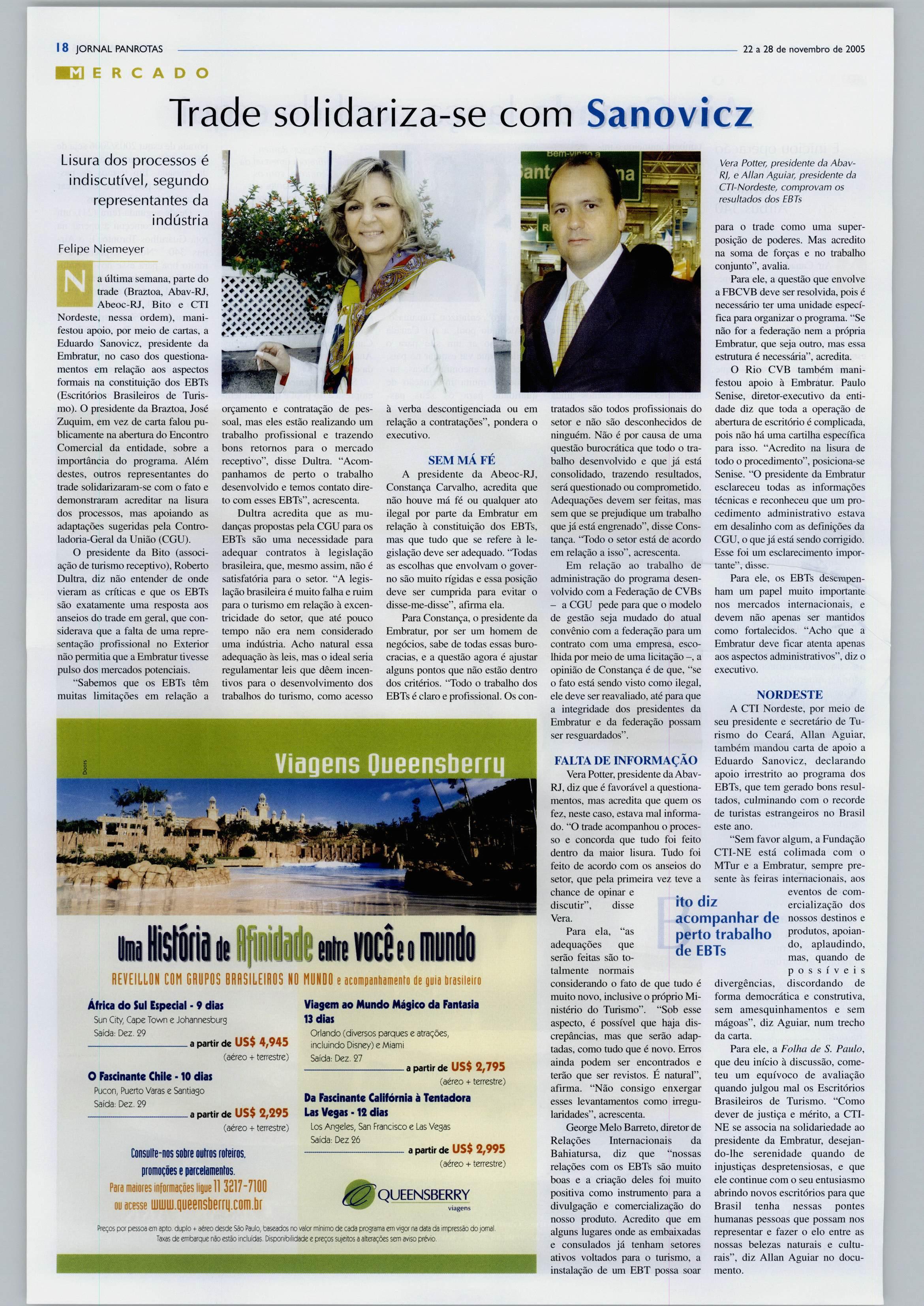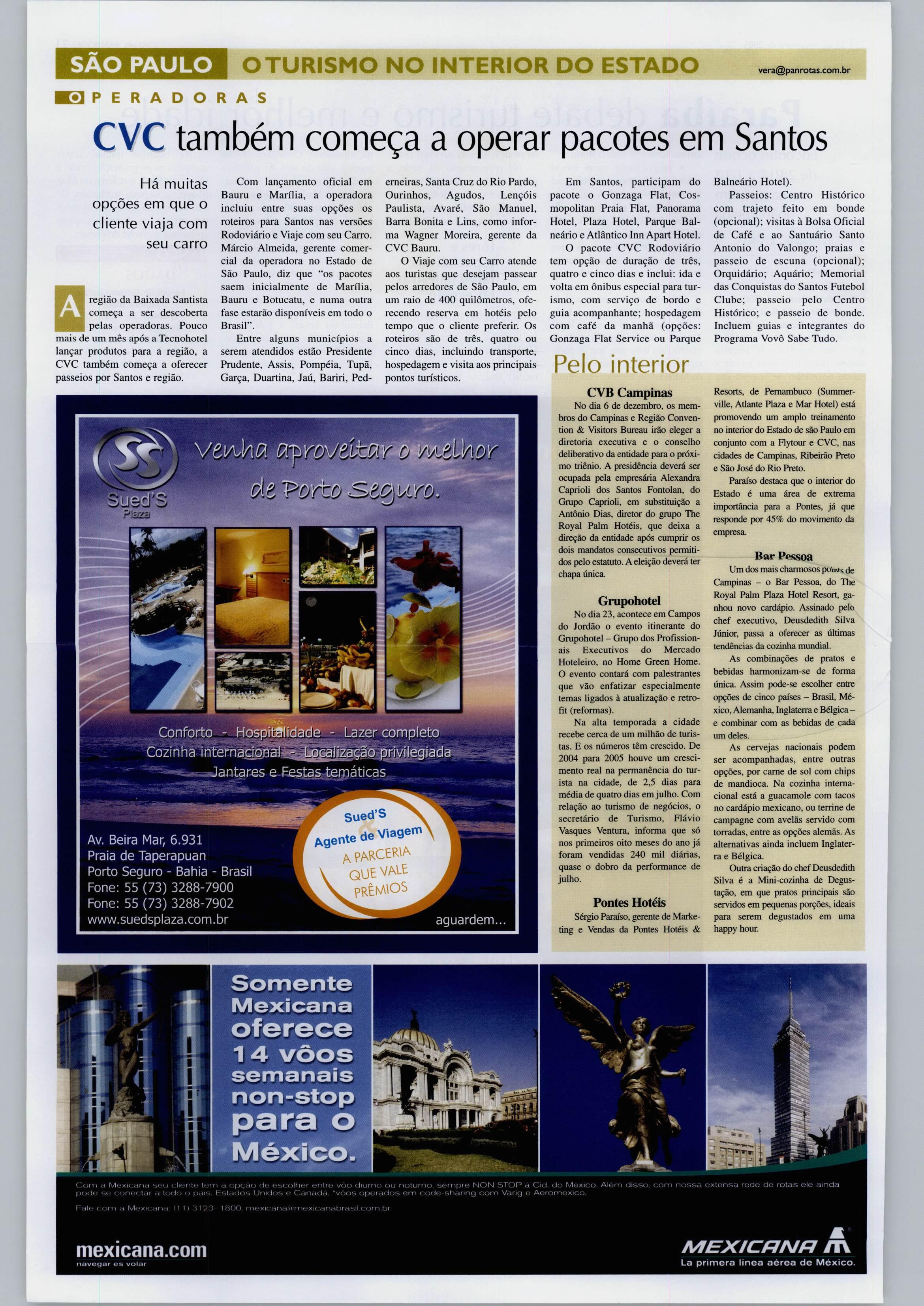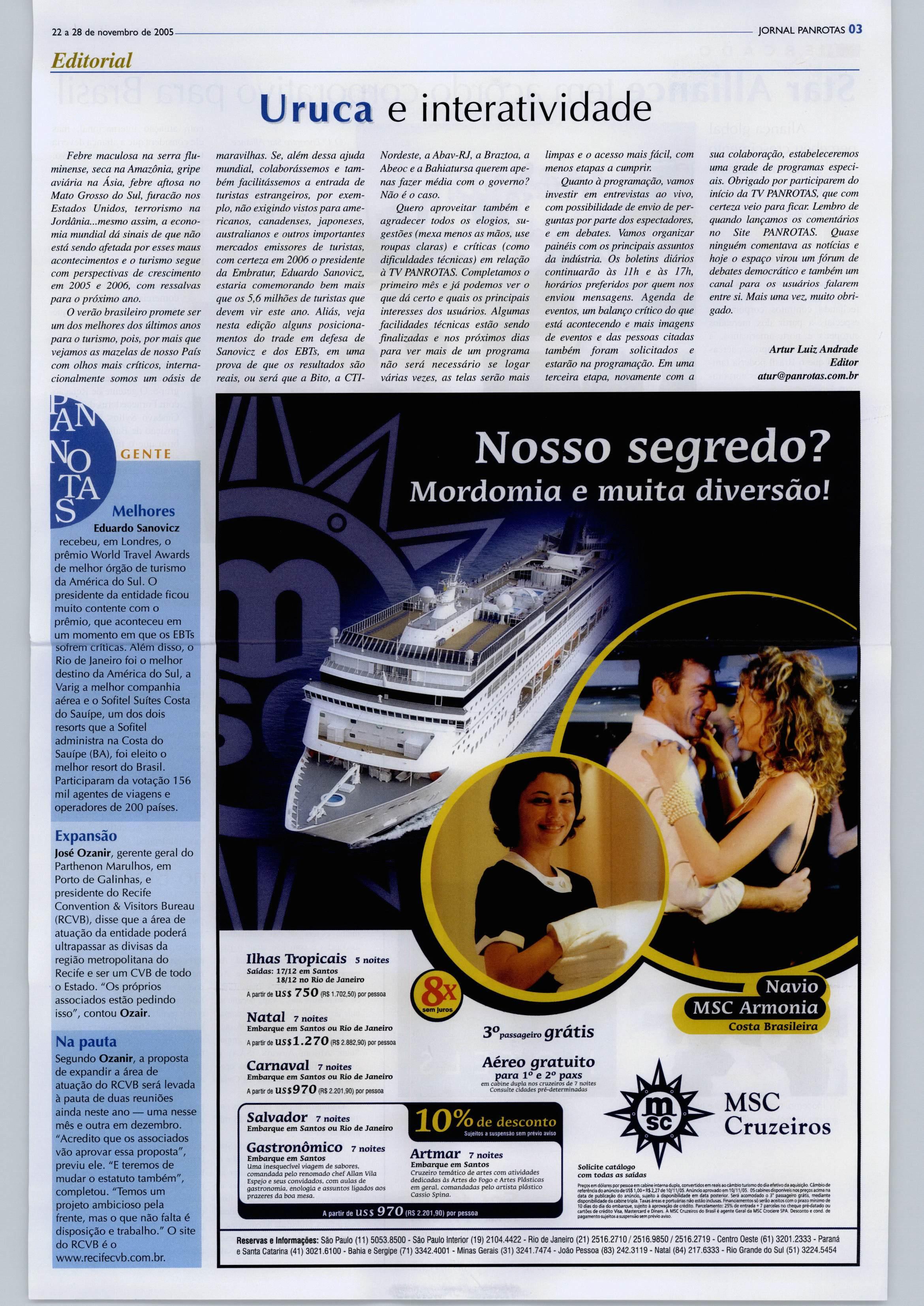 maravilhas. Se,além dessa ajuda mundial, colaborássemos e tam bém facilitássemos a entrada de turistas estrangeiros, por exem plo, não exigindo vistos para ame ricanos, canadenses, japoneses, australianos e outros importantes mercados emissores de turistas, com certeza em 2006 o presidente da Embratur, Eduardo Sanovicz, estaria comemorando bem mais queos5,6milhõesde turistas que devem vir este ano. Aliás,veja nesta edição alguns posiciona mentos do trade em defesa de Sanovicz e dos EBTs, em uma prova dequeos resultados são reais,ou será queaBito,a CTI-