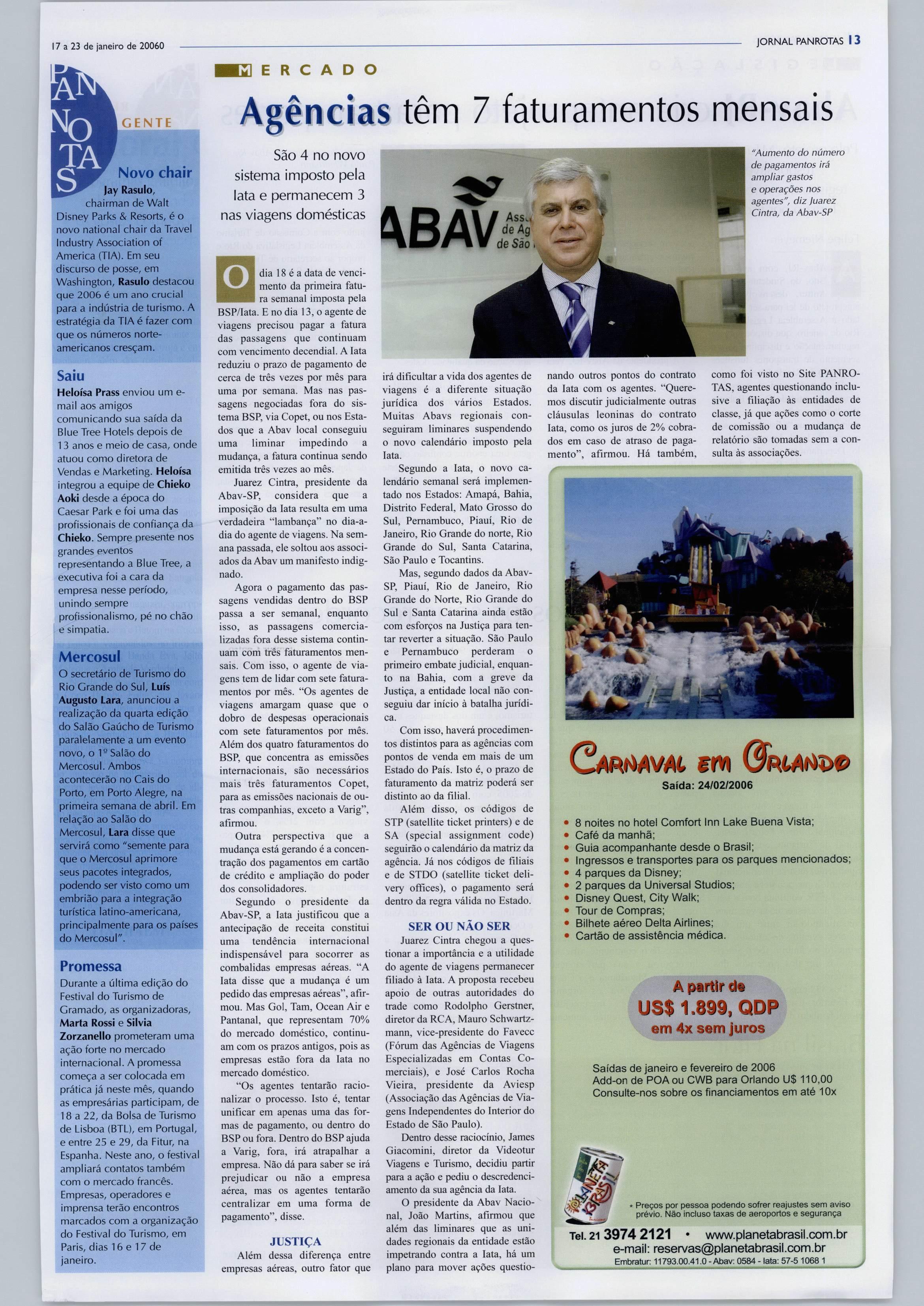 Juarez Cintra chegou a ques tionaraimportânciaeautilidade doagentedeviagens permanecer filiado à lata. A proposta recebeu apoiodeoutrasautoridadesdo trade como Rodolpho Gerstner, diretor da RCA, Mauro Schwartzmann, vice-presidente doFavecc (FórumdasAgênciasdeViagens Especializadas em Contas Co merciais),eJoséCarlosRocha Vieira, presidente daAviesp (Associação dasAgênciasdeVia gensIndependentesdoInteriordo Estado de São Paulo).