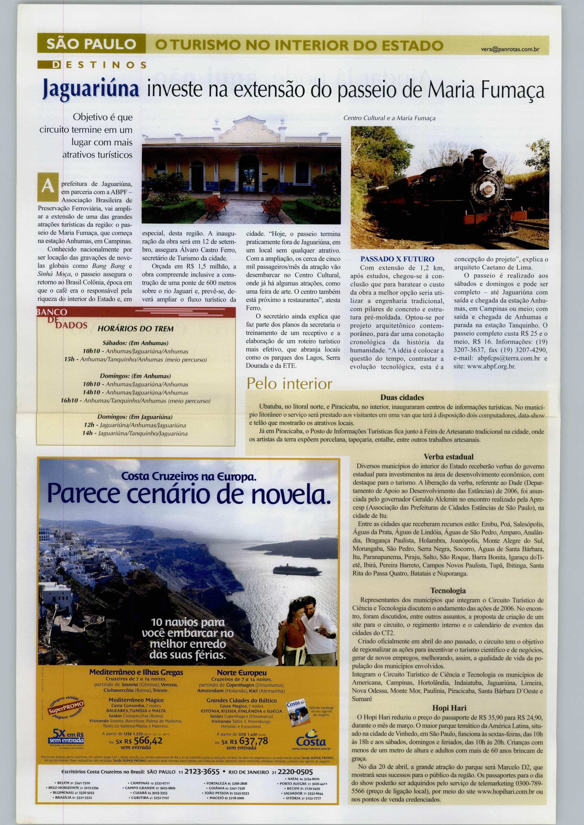 concepção do projeto", explica o arquiteto Caetano de Lima. o passeio é realizado aos sábadosedomingosepodeser completo -até Jaguariuna com saída e chegada da estação Anhu mas, em Campinas ou meio; com saída e chegada de Anhumas e paradanaestaçãoTanquinho.O passeio completo custa R$25eo meio,R$ 16. Informações: (19) 3207-3637, fax (19) 3207-4290, e-mail: abpfcps@terra.com.br e site: www.abpf.org.br.