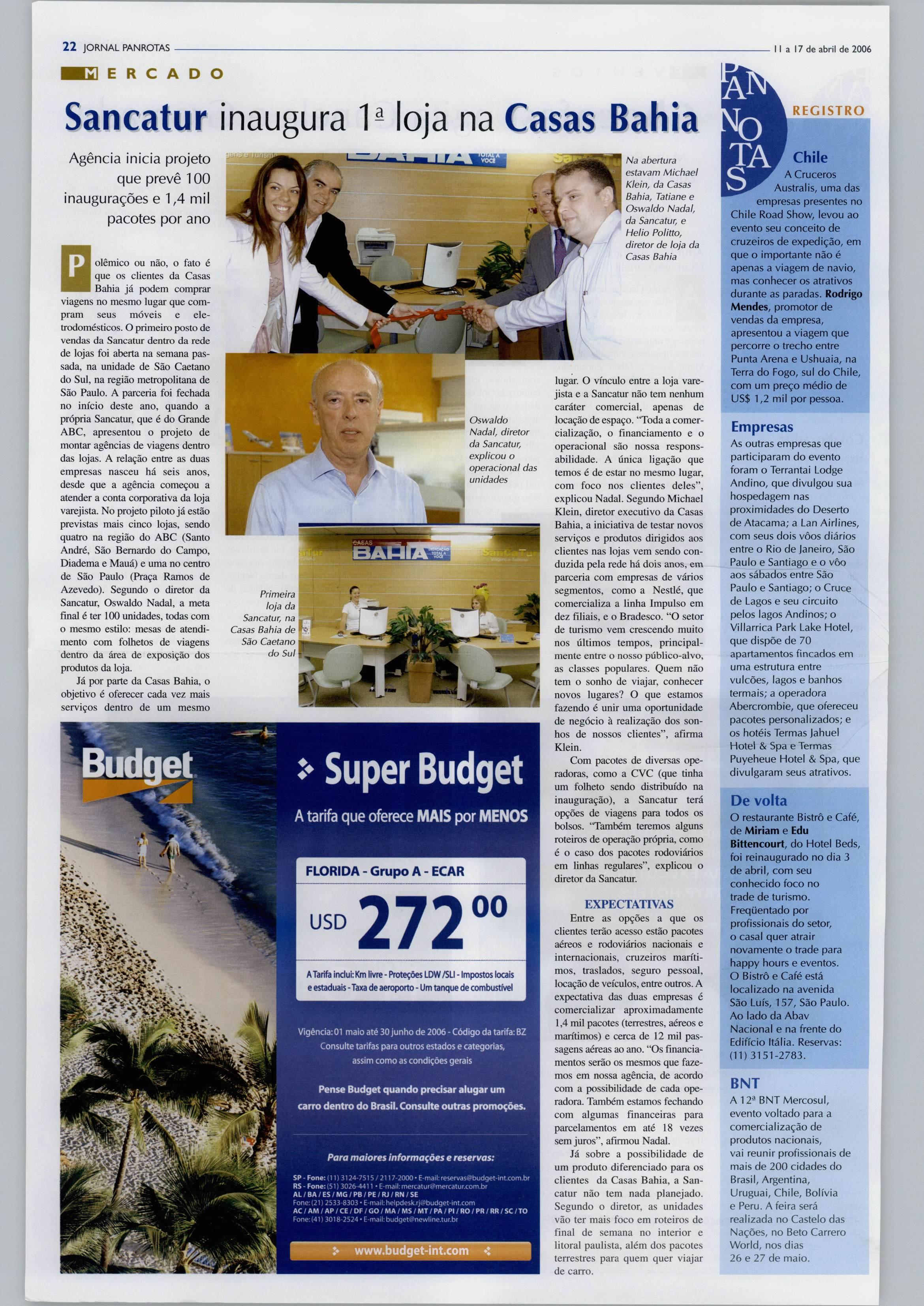 lugar.Ovínculoentrealojavare jista ea Sancatur nãotem nenhum caráter comercial, apenas de locação de espaço. 'Toda a comer cialização, o financiamento eo operacional são nossa respons abilidade. A única ligação que temos éde estar no mesmo lugar, com foco nos clientes deles", explicou Nadai. Segundo Michael Klein, diretor executivo da Casas Bahia, a iniciativa de testar novos serviços e produtos dirigidos aos clientes nas lojas vem sendo con duzida pela rede há dois anos, em parceriacomempresasdevários segmentos, como a Nestlé, que comercializa a linha Impulso em dez filiais, eo Bradesco. "O setor de turismo vem crescendo muito nos últimos tempos, principal mente entre o nosso público-aWo, as classes populares. Quem não temo sonho de viajar, conhecer novos lugares? Oque estamos fazendo éuniruma oportunidade de negócio à realização dos son hos de nossos clientes", afirma Klein. Com pacotesdediversasope radoras, como a CVC (que tinha um folheto sendo distribuído na inauguração), a Sancatur terá opçõesdeviagensparatodosos bolsos. 'Também teremos alguns roteirosde operação própria, como éocasodospacotesrodoviários emlinhasregulares", explicou o diretor da Sancatur.