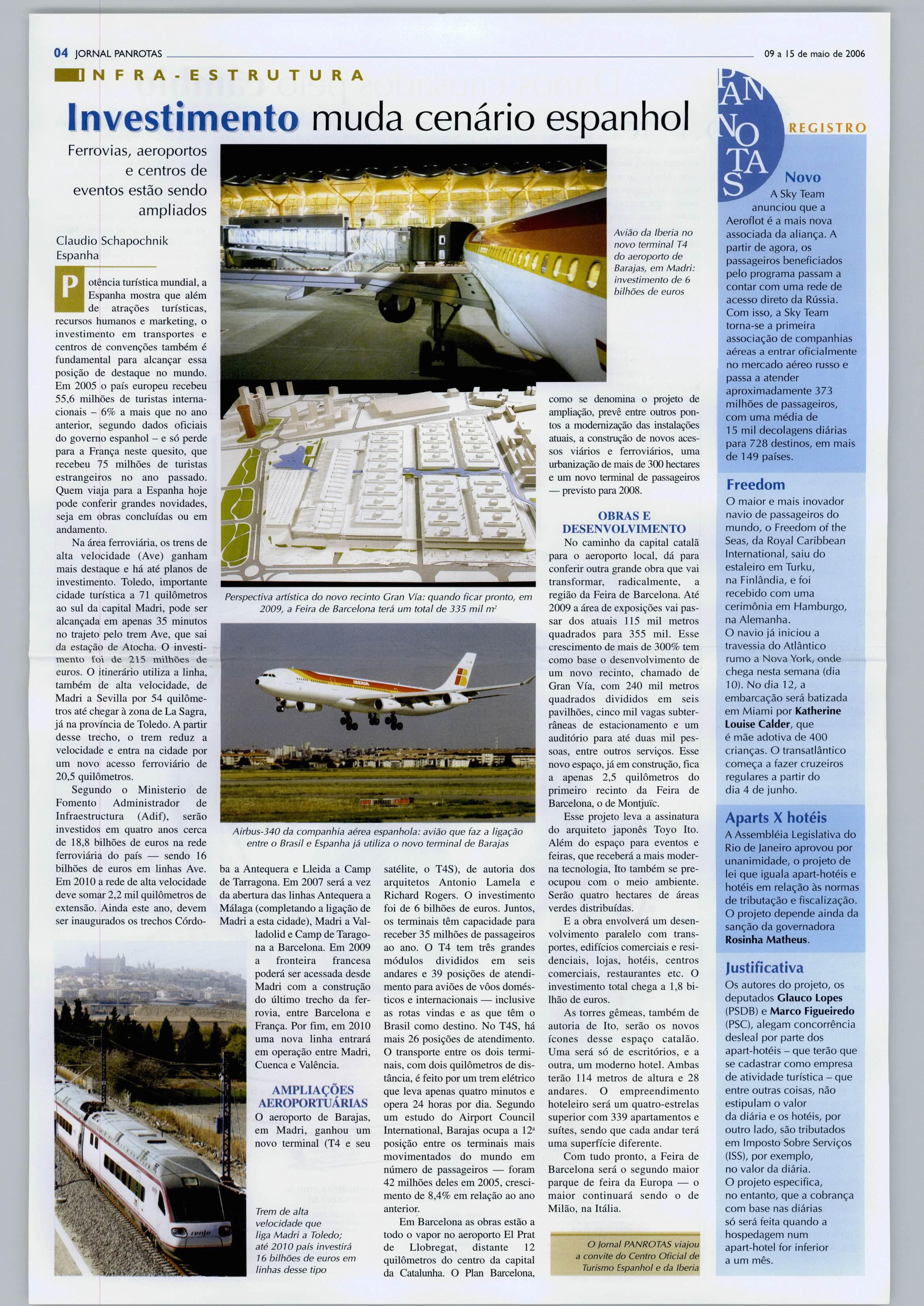 satélite, o T4S), de autoria dos arquitetos Antonio Lamela e Richard Rogers. O investimento foi de 6 bilhões de euros. Juntos, os terminais têm capacidade para receber 35 milhões de passageiros aoano.OT4temtrês grandes módulos divididos em seis andares e39 posições de atendi mento para aviões devôos domés ticos e internacionais inclusive as rotas vindas eas que têmo Brasil como destino. No T4S, há mais26 posições de atendimento. O transporte entreos dois termi nais, com dois quilômetros dedis tância, é feito por um trem elétrico que leva apenas quatro minutos e opera 24 horas por dia. Segundo um estudo do Airport Council Intemational, Barajas ocupa a 12' posição entre os terminais mais movimentados do mundo em número de passageiros foram 42 milhões deles em 2005, cresci mento de 8,4% em relação ao ano anterior.