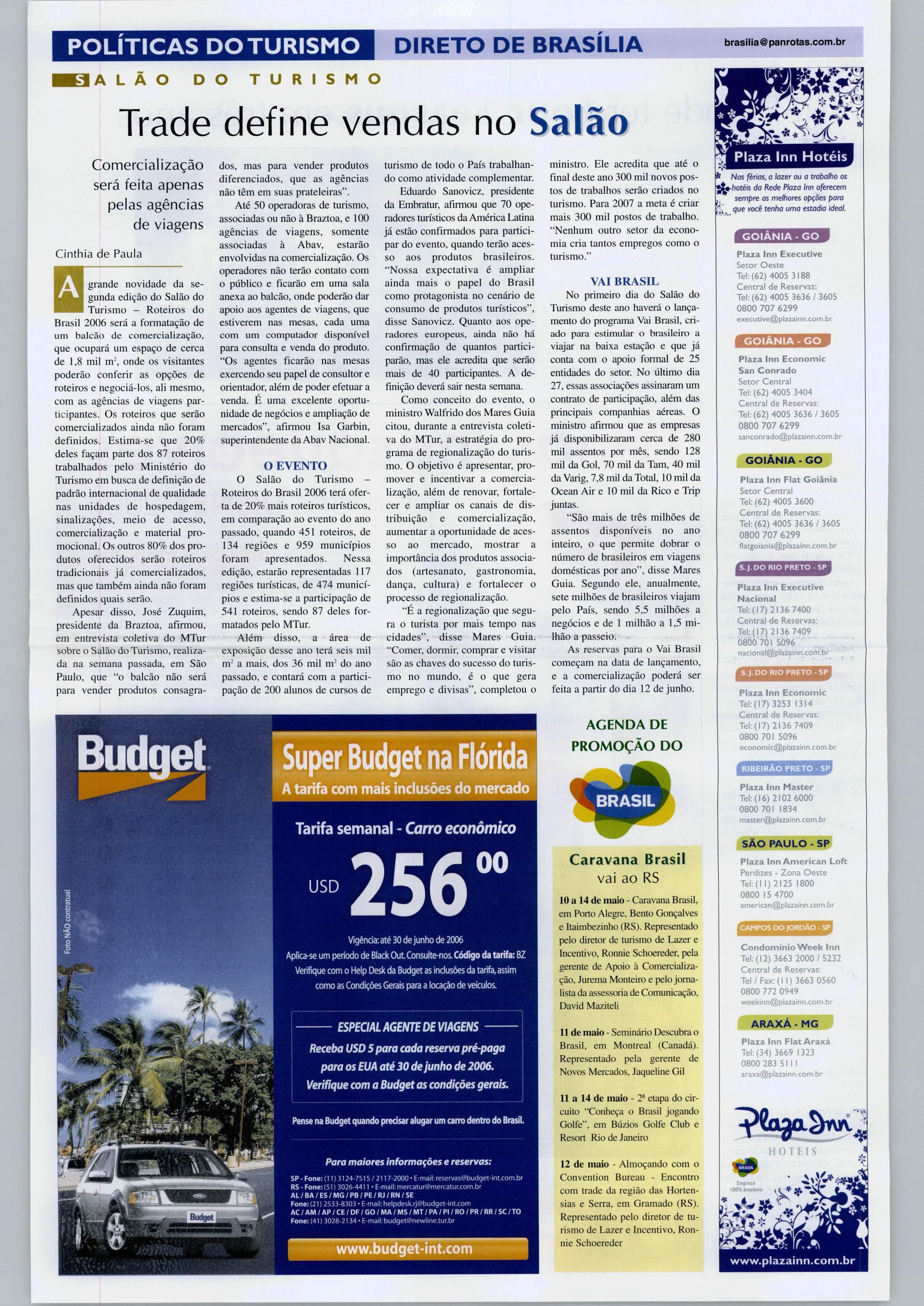 Caio Luiz de Carvalho e seu W' diretor de Mar keting na Embratur, Roston Nascimento, garantiram espaço paraoBrasilna celebração do milênioem Walt Disney World Alguém se lembra de José Bota^ Pois é, foi ministro da Indústria, Comércio e Turismo. Pelo menos Caio Luiz de Carvalho permaneceu na Em bratur.Mascomodissemoshoje,o Turismosórespirou sozinho no governo Lula, duela a quem dueIa, como disse um dia um de nos sos líderes. Quem foi mesmo?