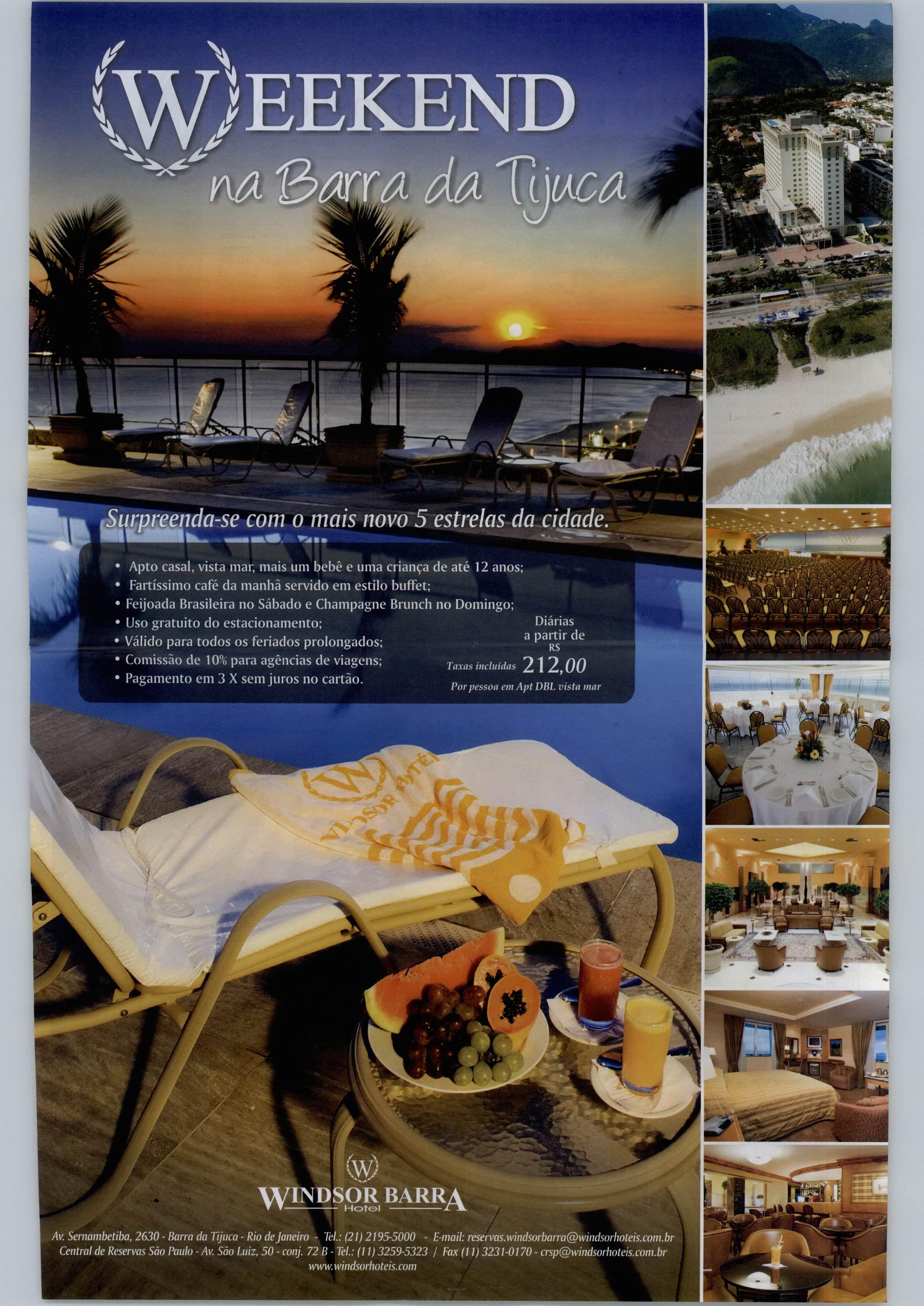 Outro hotelque merece destaquenaáreadeeventoséo WindsorBarra,naBarradaTijuca. O hotel, um dos mais novos da cidade, conta com 25 salões, o maiorparaaté1,2milpessoas, inclusivecomespaçoparamon tagem deaté50estandes."Játemos eventosagendadosparaohotelaté 2008 (a média de eventos realizados édedezdegrandeportepormês).