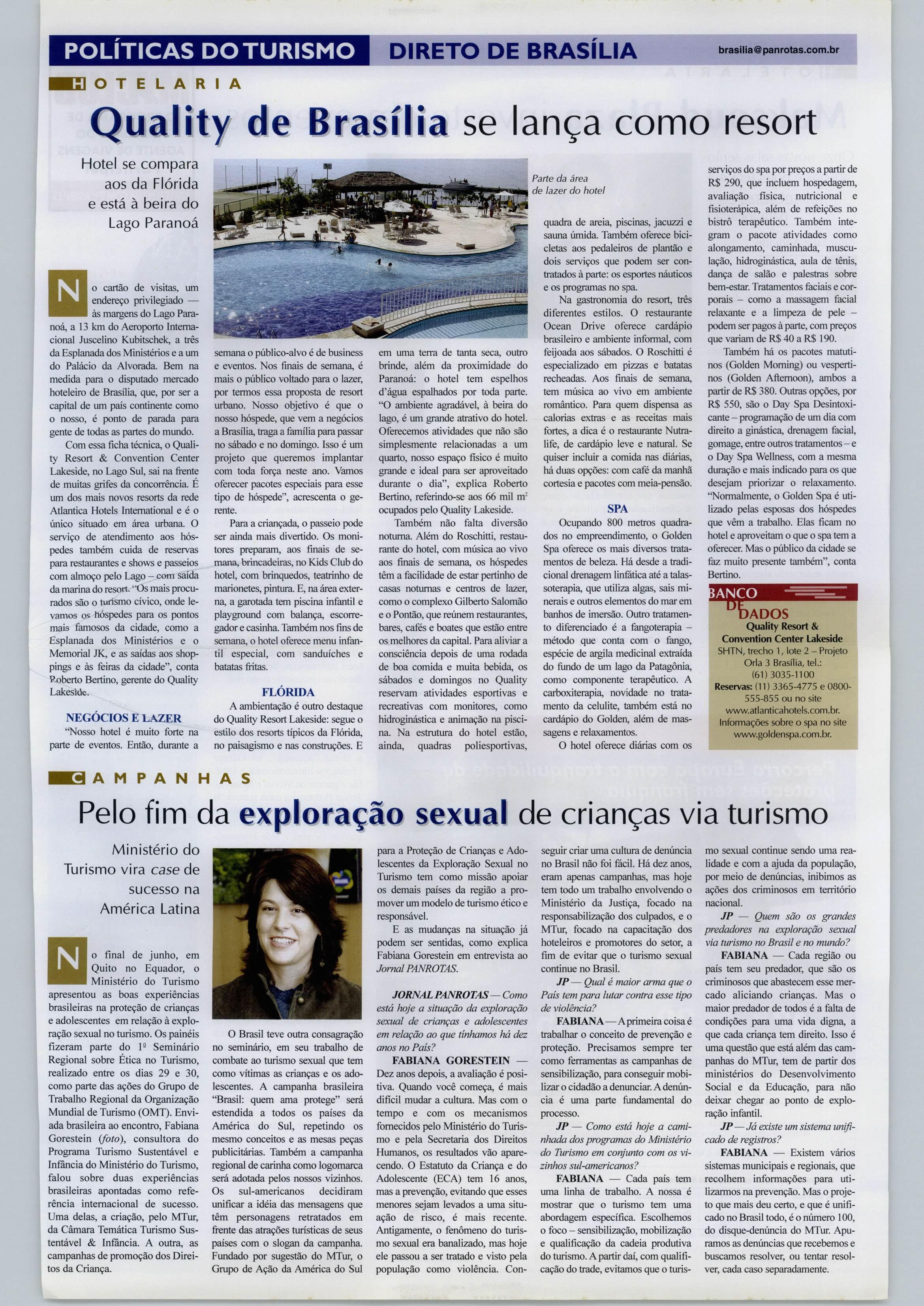 o cartão de visitas, um endereçoprivilegiado— às mai^ens doLagoPara noá,a13kmdo Aeroporto Interna cional Juscelino Kubitschek, atrês da Esplanada dos Ministérios eaum do Palácio da Alvorada. Bem na medidaparaodisputadomercado hoteleirodeBrasília,que,porsera capitaldeumpaíscontinentecomo onosso,épontodeparadapara gentedetodasaspartesdomundo. Com essafichatécnica,oQuall tyResort& Convention Center Lakeside,noLagoSul,sainafrente demuitasgrifesda concorrência E um dos mais novos resorts da rede Atíantica Hotéis Intemational eéo único situado em área urbana. O serviçodeatendimentoaoshós pedestambémcuidadereservas pararestauranteseshowsepasseios com almoço pelo Lago -comsaída da marina doresort. "Os maisprocu rados sâo o tvirismo cívico, onde le vamososhóspedesparaospontos mais famosos da cidade, como a Esplanada dos Ministérios eo Memorial JK, eassaídasaosshoppingseàsfeirasdacidade",conta P^berto Bertino,gerentedoQuallty Lakeside.
