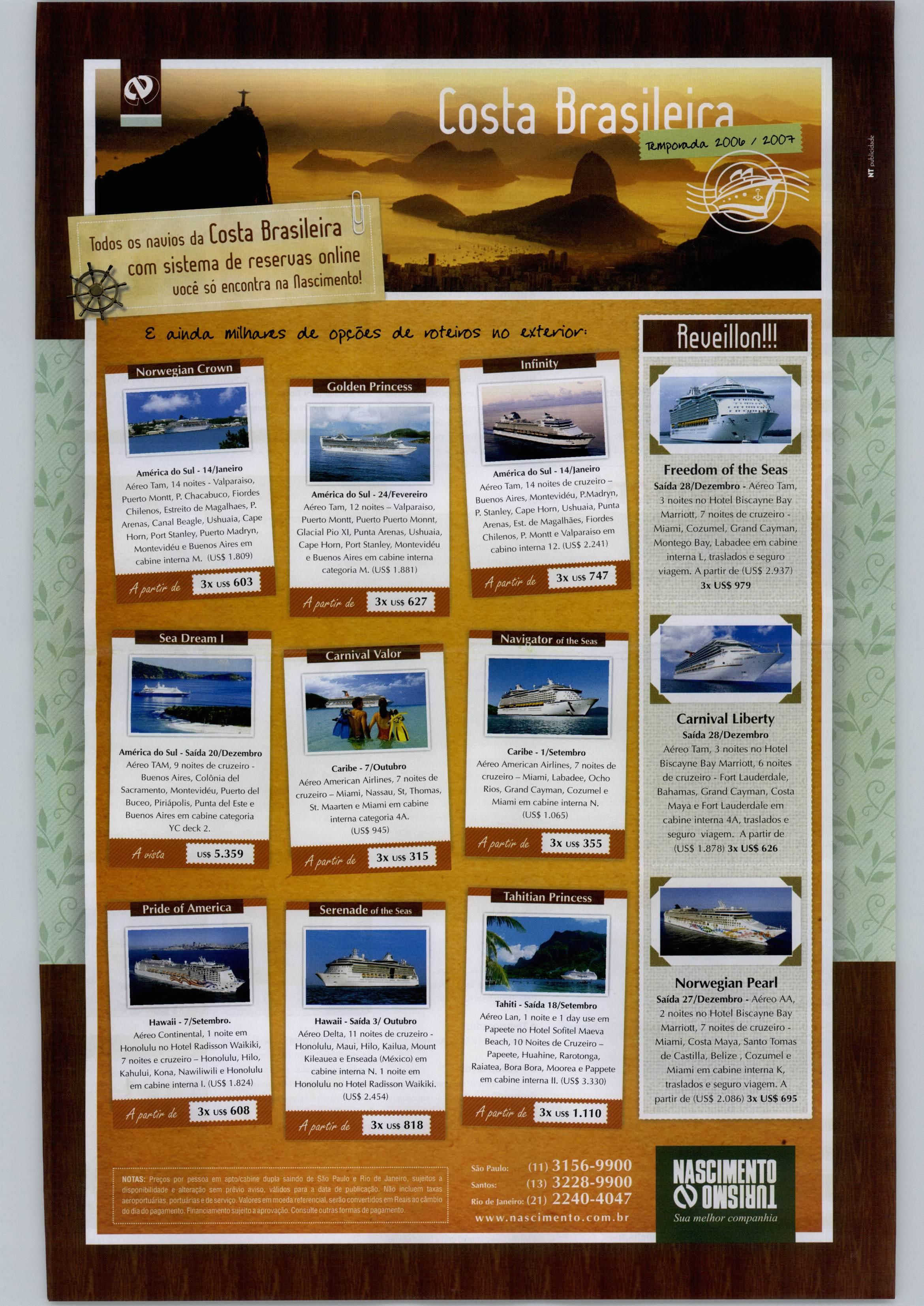 Aoperadora Nascimento Turismojá atingebonsíndicesde vendas de cruzeiros. Plínio Nascimento, diretor da empresa, avisa: "Já temos várias saídas fechadas, quem ainda quiser tem que correr.A temporada vai ser um sucesso".