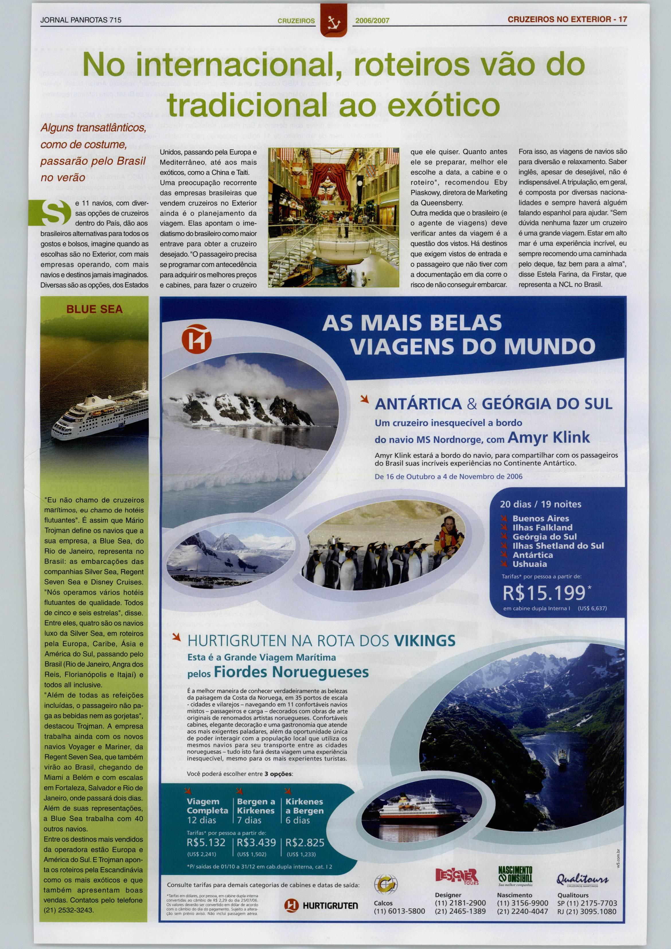 E Hirsch anunciou uma novidade: "Estamos lançando esse ano uma viagem marítima regular pelos fiordes da Noruega. Não são cruzeiros, pois não há shows ou concertos, são viagens regulares operadas em 13 grandes navios que transportam cargas e passageiros, com paradas em todos osportos."A Qualitours montou um pool desse produto coma Nascimento, Calços e Designer. Tel.; (11) 2175-7703, comMônica