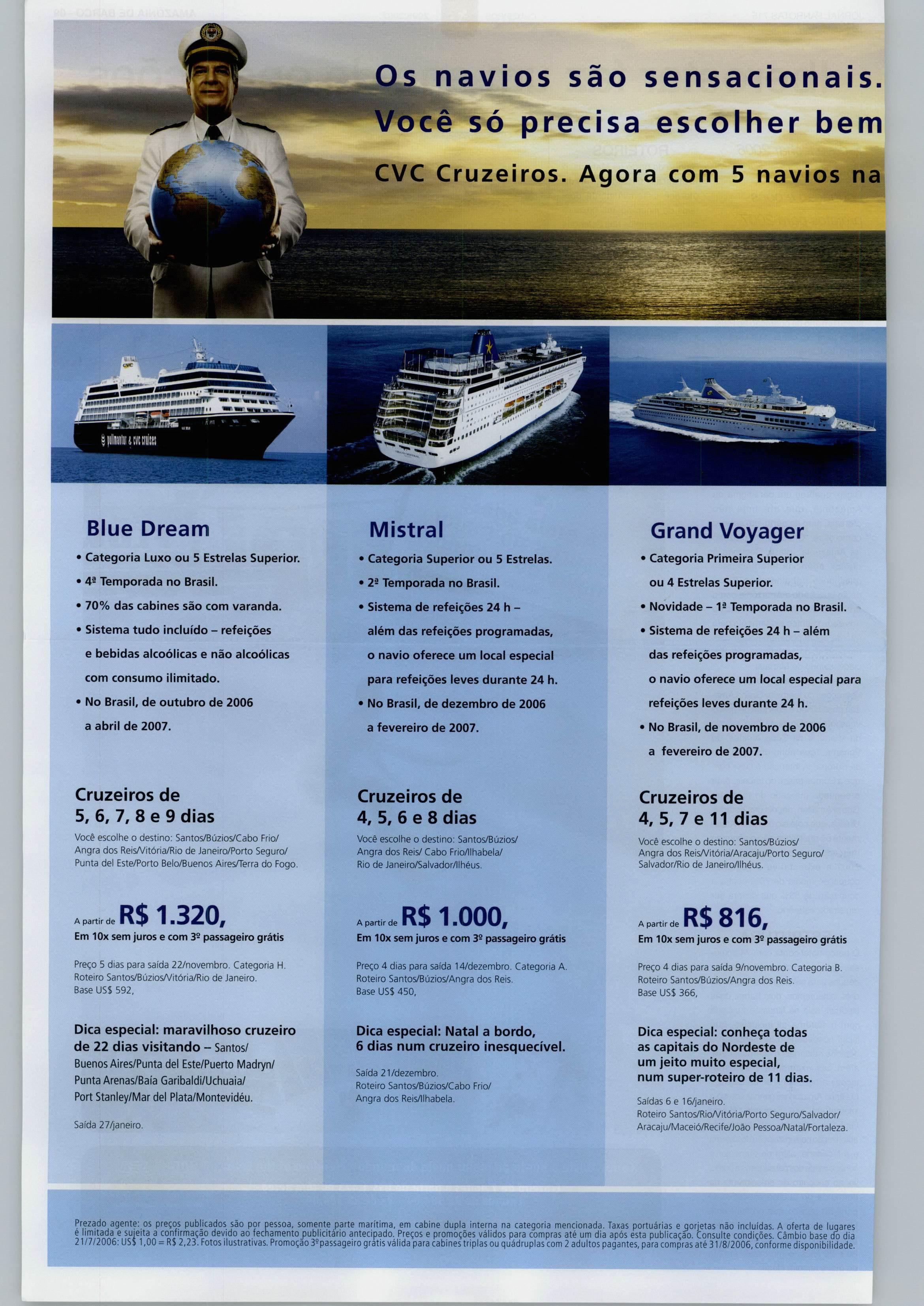 -7 notíee^ St.Thomas,St. John, St. Barthelemy, Tortola, Jostvan Dyke, Virgin Gordae St. Thomas Saída:Dez. 30,2006 a partir de US$ 1,979 (RS 4.532) (cruzeirocomtodasasrefeições incluídas egorjetasabordo)