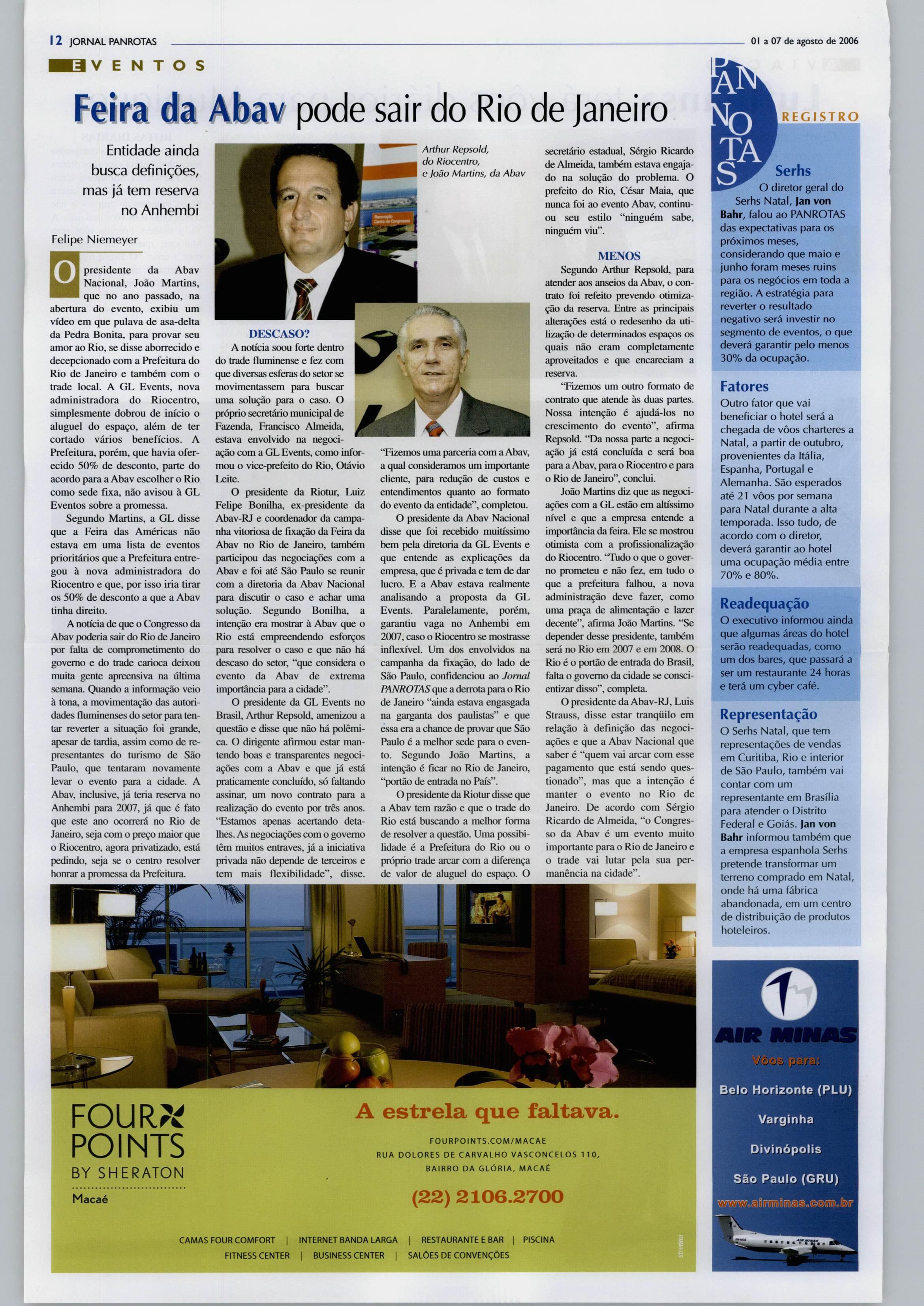 A Associação Brasileira de Agências de Viagens do Rio^ de janeiro (Abav-Rj), presidida porLuís Strauss, e? o Sindicato dasEmpresas déTurismo do Rio de janeiro, (Sindetur-Rj) firmaram parceria com a empresa Planet Work, que oferece treinamentos específicos em diversas áreas para o profissional de turismo, segundo a Abav, para a ^ realizaçãode cursos. S