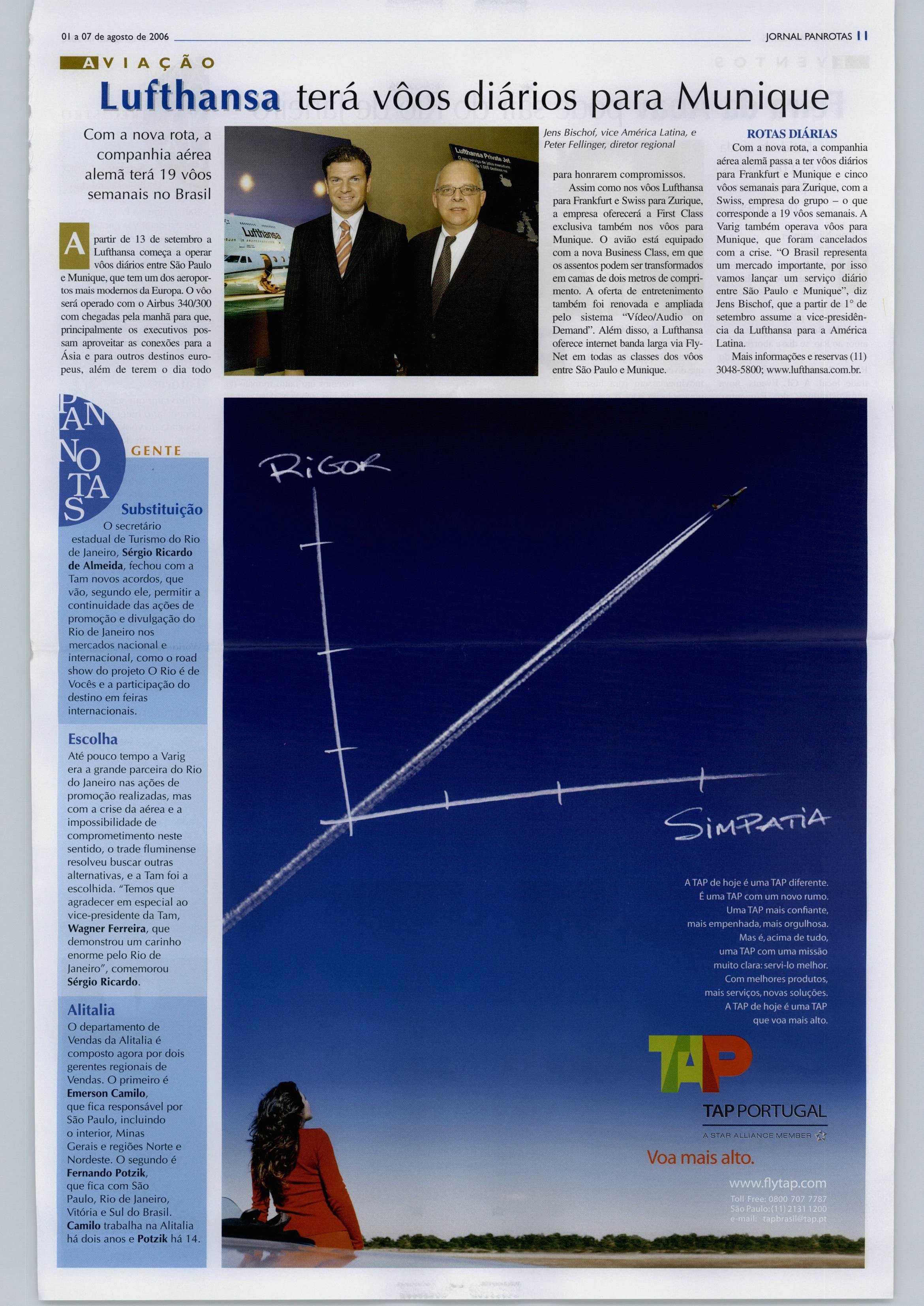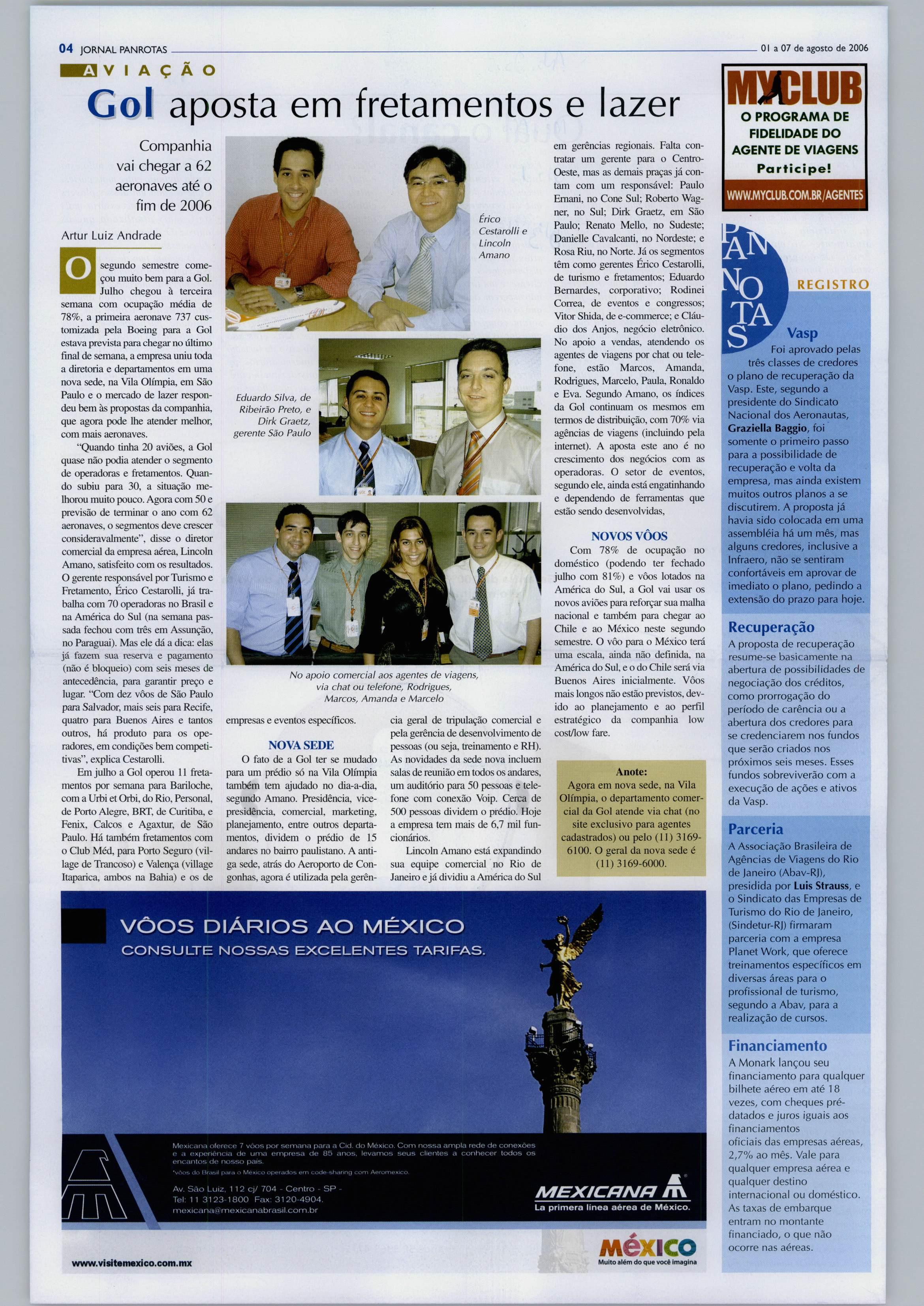 emgerênciasregionais.Faltacon tratarumgerenteparaoCentroOeste,masasdemaispraças já con tam com umresponsável:Paulo Eraani, noConeSul;RobertoWag ner,noSul; Dirk Graetz, em São Paulo; Renato Mello, no Sudeste; Danielle Cavalcanti, no Nordeste; e Rosa Riu,noNorte.Jáos segmentos têmcomogerentesEricoCestarolli, de turismo e fretamentos; Eduardo Bemardes, corporativo; Rodinei Corrêa, de eventos e congressos; Vítor Shida, de e-commerce; e Cláu diodosAnjos, negócio eletrônico. Noapoioavendas, atendendo os agentesdeviagensporchatoutele fone, estão Marcos, Amanda, Rodrigues,Marcelo,Paula,Ronaldo eEva.SegundoAmano,osmdices da Gol continuam os mesmos em termosdedistribuição,com70%via agênciasdeviagens(incluindopela intemet).Aapostaesteanoéno crescimento dos negócios com as operadoras. Osetordeeventos, segundoele,aindaestáengatinhando edependendodeferramentasque estão sendo desenvolvidas.