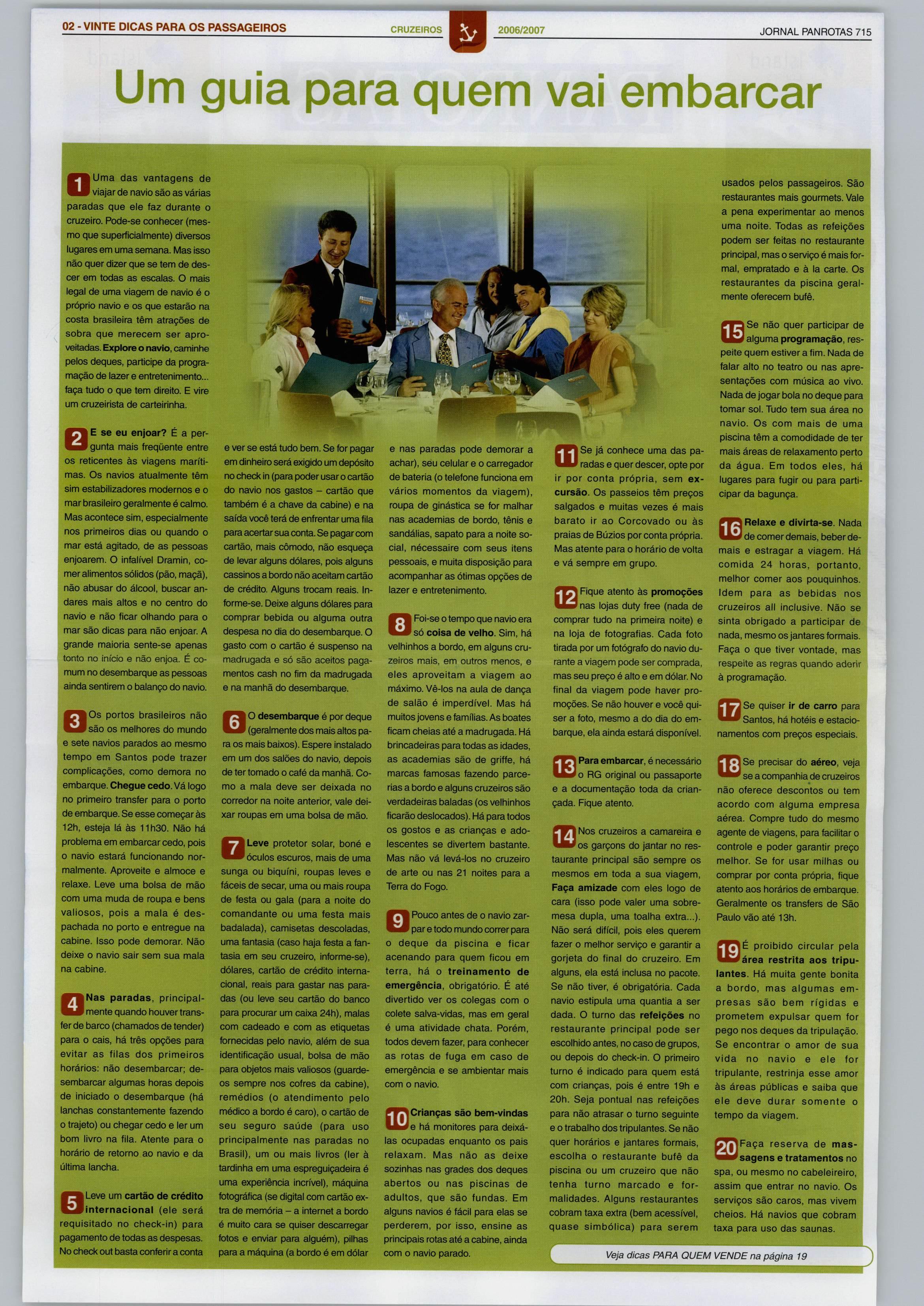 Faça uma pasta para cada navio, com opiniões suas, reportagens, cartas de cliente, fotos. Fica mais fácil na hora de tirar uma dúvida. E tenha sempre na ponta dos dedos os sites de cada companhia marítima.