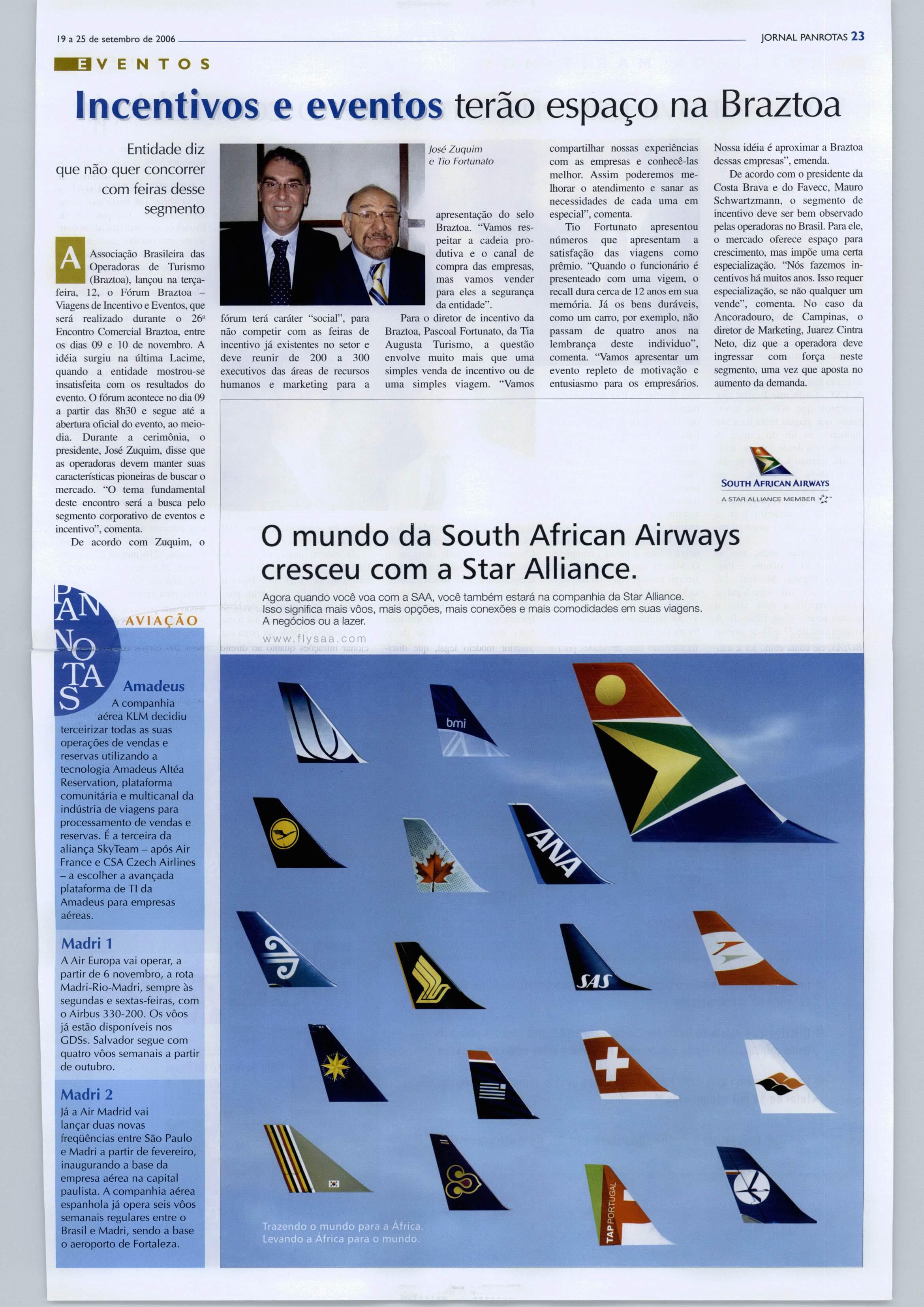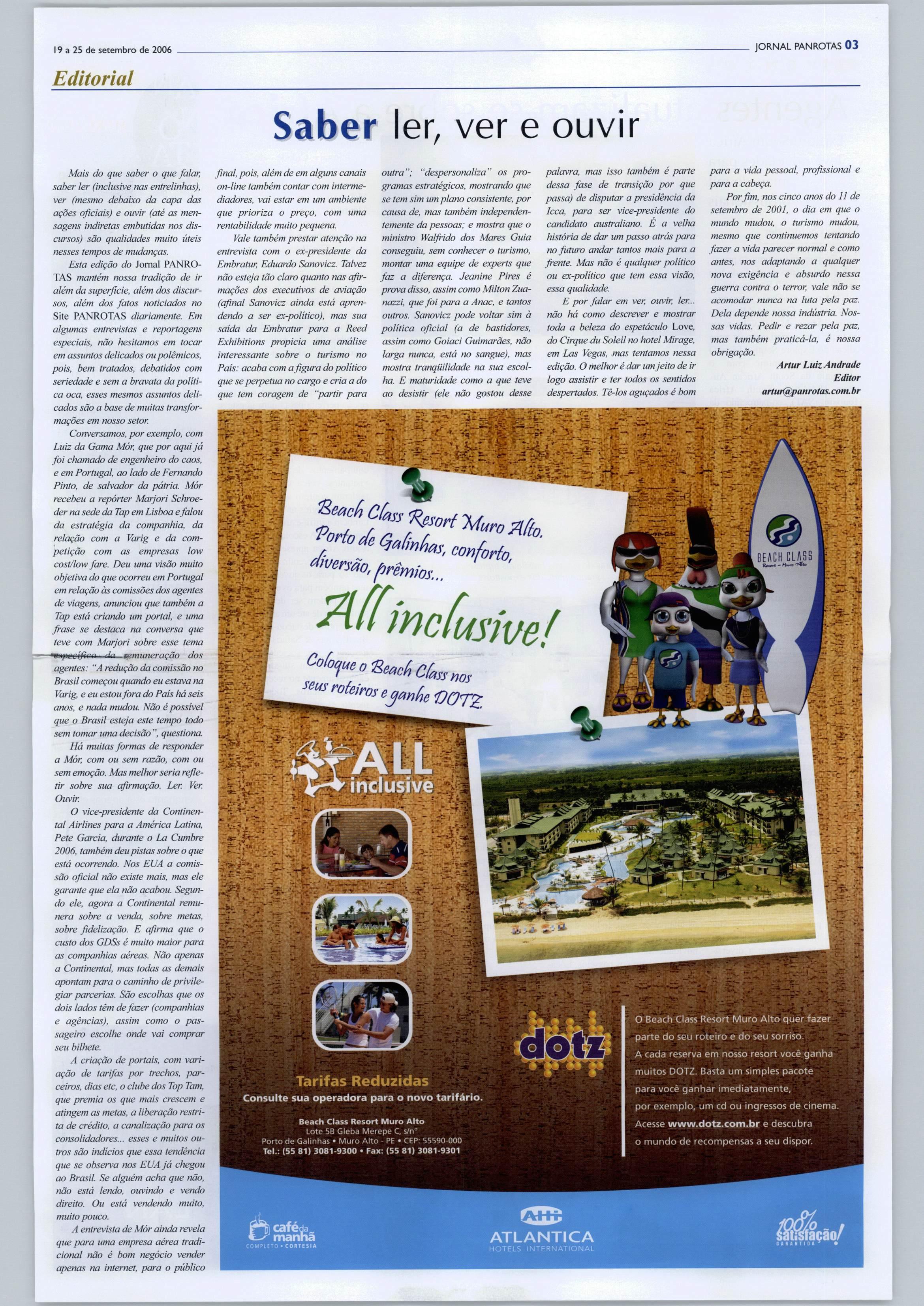 Esta edição doJornal PANRO TAS mantém nossa tradição deir alémdasuperfície,alémdosdiscur sos, além dos fatos noticiados no Site PANROTAS diariamente. Em algumas entrevistas e reportagens especiais, não hesitamos em tocar em assuntos delicados oupolêmicos, pois,bemtratados,debatidoscom seriedade esema bravata da políti ca oca. esses mesmos assuntos deli cados são a base de muitas transfor mações em nosso setor Conversamos, por exemplo,com Luizda Gama Mór,que por aqui já foi chamado de engenheiro docaos, eem Portugal, aoladode Fernando Pinto,de salvador da pátria. Mór recebeu a repórter Marjori SchroedernasededaTapem Lisboa e falou da estratégia dacompanhia,da relação comaVarige da com petição comas empresas low cost/low fare. Deu umavisãomuito objetivadoqueocorreuem Portugal em relação às comissões dos agentes de viagens, anunciou quetambéma Tap está criando um portal, euma frase se destaca na conversa que tevecom Marjori sobre esse tema Tm^rríjírti da ucrmmrraràr dos agentes: "A reduçãodacomissãono Brasil começou quando eu estava na Varigeeuestou fora do Pais háseis anos,e nada mudou.Não é possível queo Brasil estejaestetempotodo sem tomar uma decisão ", questiona. Há muitas formas de responder a Mór, com ou sem razão, com ou sememoção.Mas melhor seria refle tir sobre sua afirmação. Ler Ver. Ouvir