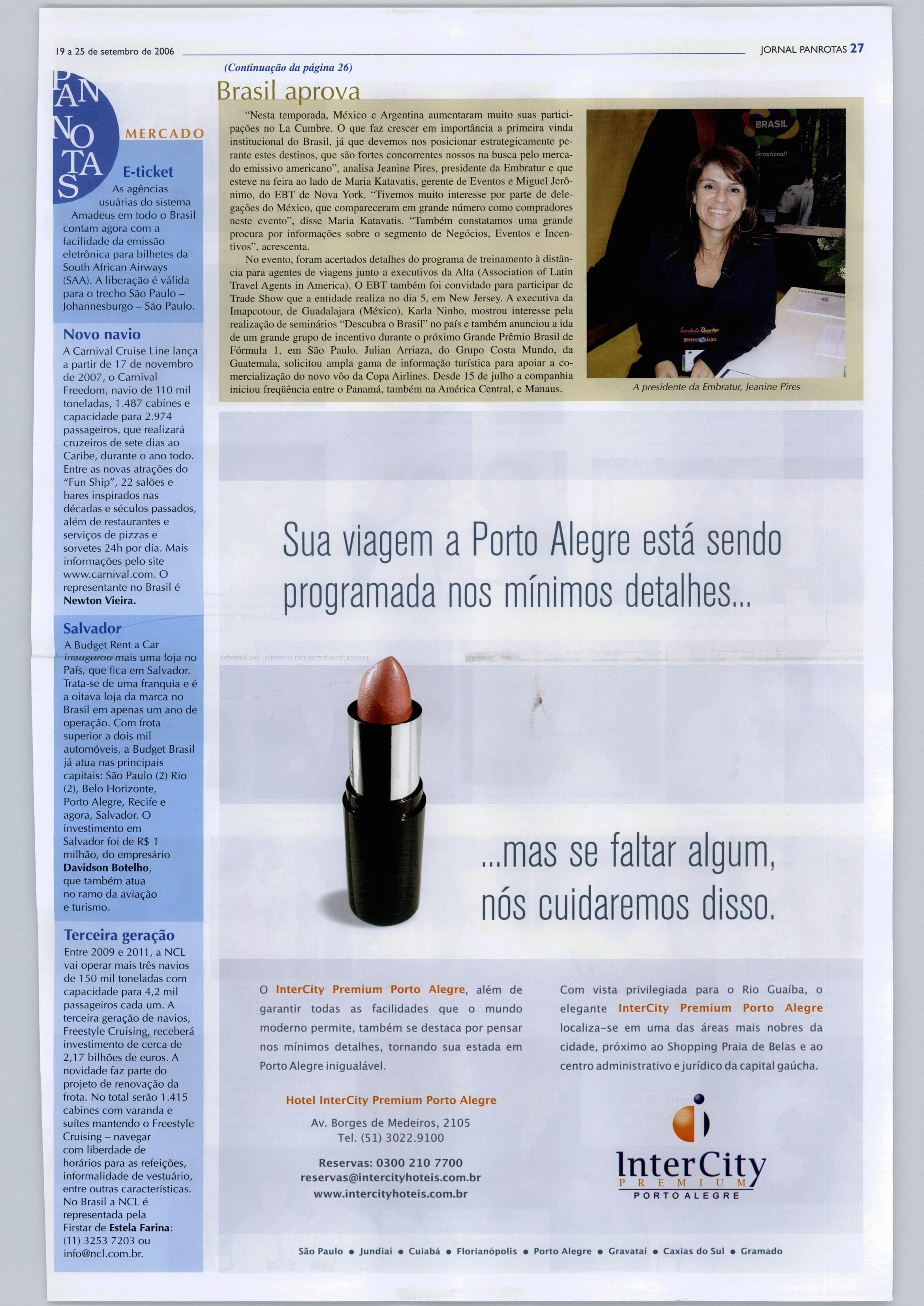 fosquea escolha de Jeanine Pires trazao governo federal. Sanovicz conversou com o PANROTAS no La Cumbre 2006, em Las Vegas, e também divulgou que decidiu compor com o candidato aus traliano à presidência da Icca. Segundo ele, ainda nãoé chegada a hora de um presidente latinoamericano na entidade, onde Sanovicz deverá ser vice-presi dente.