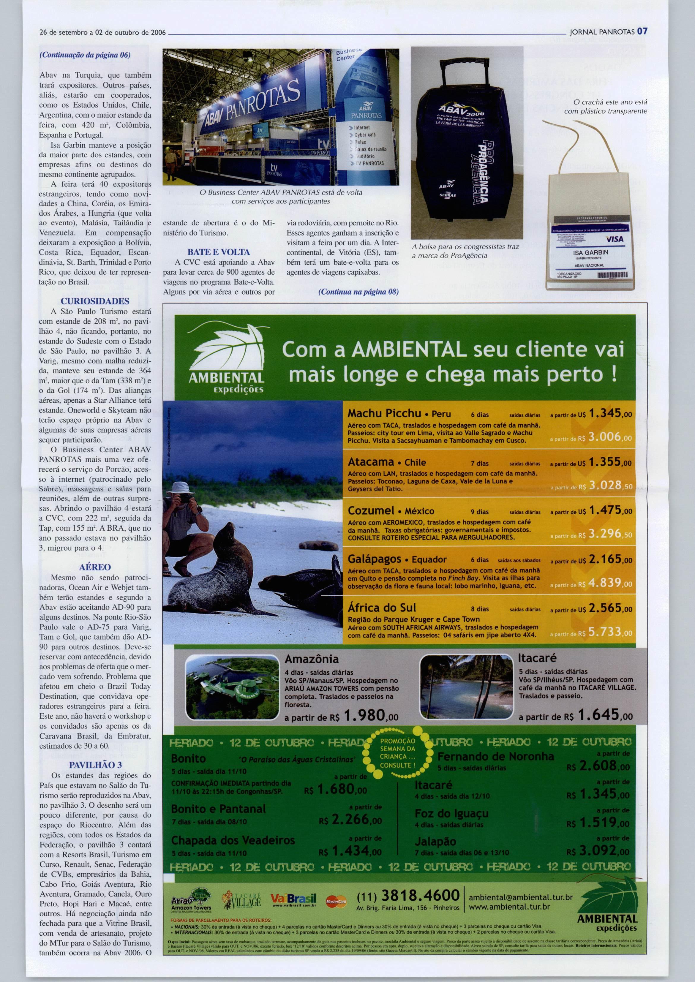 Esteanoo lay-out daexposição continuaomesmodoanopassado. Haviaapossibilidadedeopavilhão 1,deentrada,serinterditadopor causa dasobrasparaoPan2007, mas isso não ocorreu. Assim, tudo ficacomoantes—pavilhão3para aréplicadepartedoSalãodoTuris moealgunsdestinosnacionais,e pavilhão 4paraas empresas. Aprincipalmudançafoinodia doevento:afeira,queanteserade quinta-feiraasábadoparaosprofis sionais,está começando umdia antes.Dequarta-feira,25,asextafeira,27,a Abav 2006éapenaspara profissionais da indústria e Isa Garbin,superintendentedaAbav Nacional,afirmaqueaentidade continuarárigorosanocontroledos