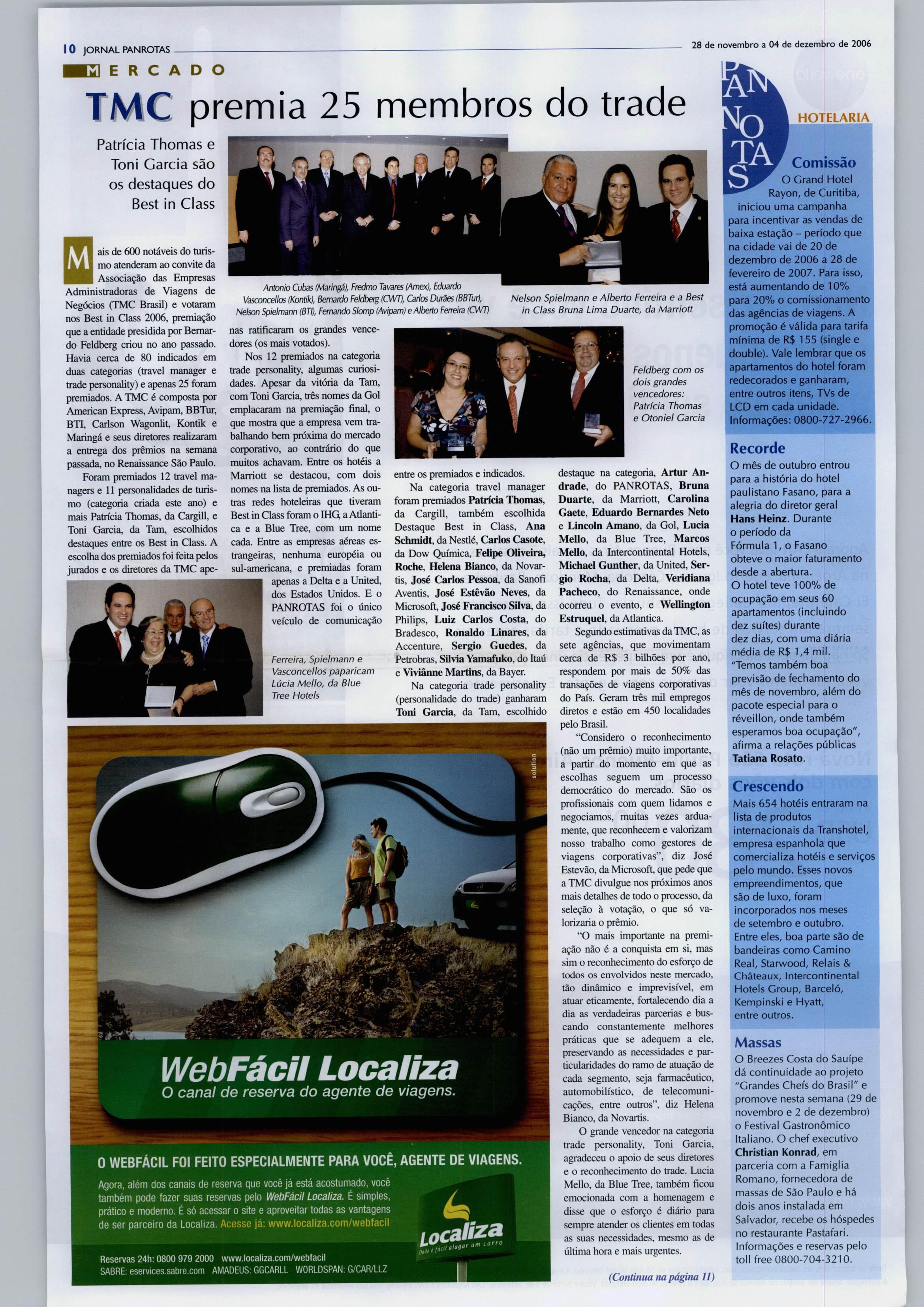 Wallner, há 25 anos m empresa) à Produção, com Marianna Alcorta, da área comercial com Luís Carlos Borges à administrativa, com Solange Falcão, a distribuição, com João Lopes,todaa área tecnológi ca,que acaba de mudar o Site PANROTAS, com Ricardo Tsugawa, nossos colaboradores por todo o País, e todos, claro, sob o comando do fundador e presidente da PANROTAS, Guillermo Alcorta. Somos umaequipe, mas cuja afi nação dependedesse feedback que vocês nos dão via comentários no Site PANROTAS, e-mails, críticas ao pé doouvido,elogios, sugestões e,quebom, prêmios comooda TMC Brasil