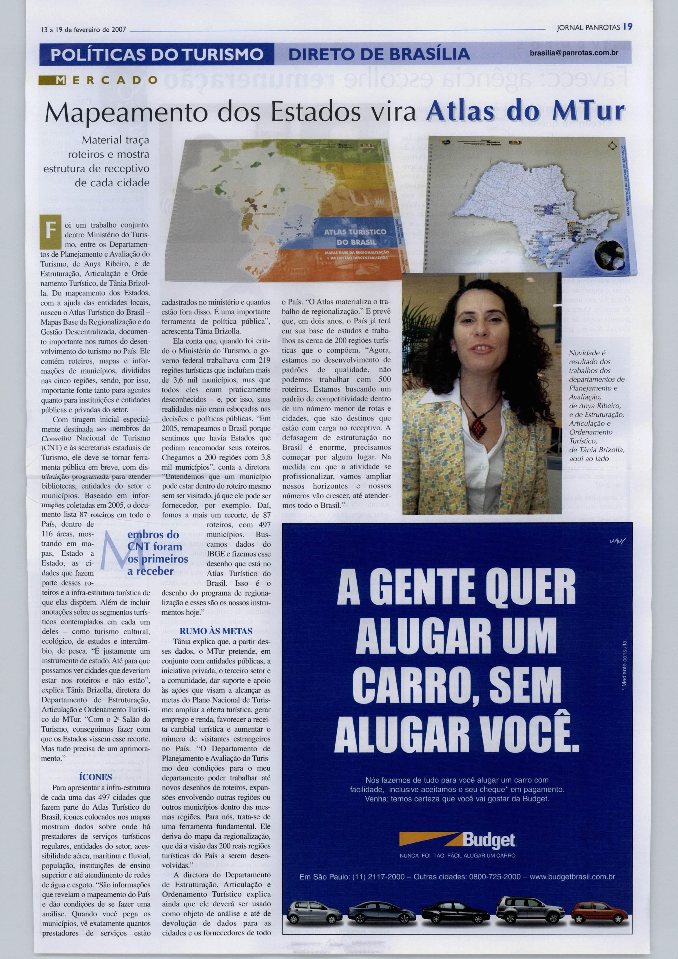 Boi um trabalho conjunto, dentro Ministério do Turis mo, entre os Departamen tosde Planejamento eAvaliaçãodo Turismo,deAnyaRibeiro,ede Estruturação.ArticulaçãoeOrde namento Turístico, de Tânia Brizolla. Do mapeamento dosEstados, comaajudadasentidadeslocais, nasceu o Atlas Turístico do BrasilMapasBasedaRegionalizaçãoeda Gestão Descentralizada, documen toimportantenosrumosdodesen volvimento do turismo no País. Ele contémroteiros,mapaseinfor maçõesdemunicípios,divididos nascincoregiões,sendo,porisso, importantefontetantoparaagentes quantoparainstituiçõeseentidades públicaseprivadasdosetor.
