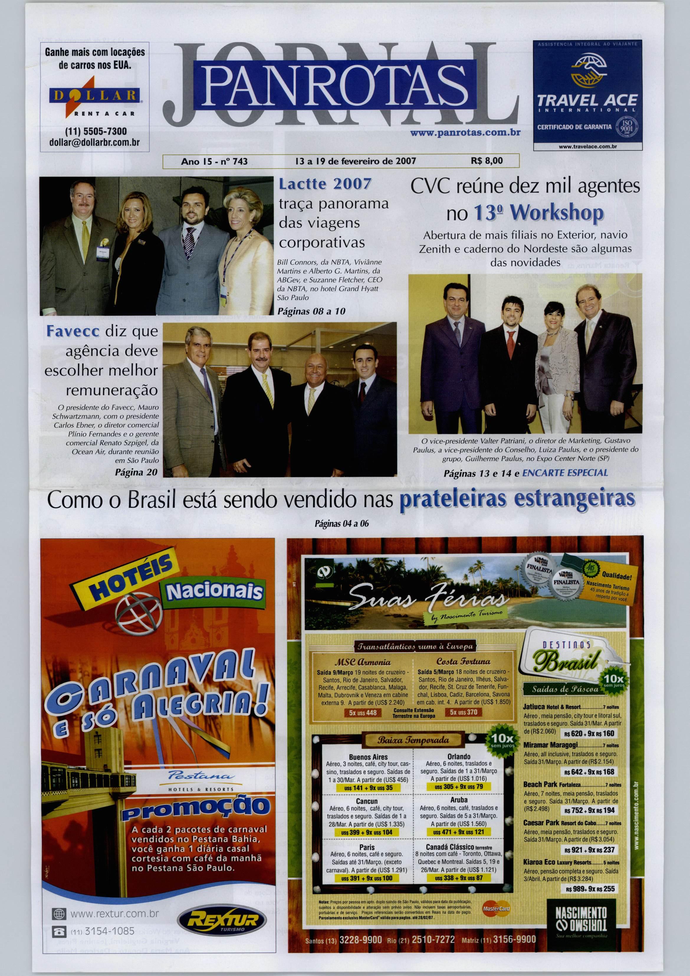 J TA rn Ganhe mais com locações de carros nos EUA. A > !. I O PANROTAS TRAVEL ACE INTERNATIONAL í^is6\ CERTIFICADO DE GARANTIA (11) 5505-7300 dollar@dollarbr.com.br Ano 15 - n® 743 www.panrotas.com.br www.travelace.coni.br 13a 19 de fevereiro de 2007 R$ 8»00 Lactte 2007 traça panorama das viagens corporativas 6/7/ Connors, da NBTA, Viviânne Martins e Alberto C. Martins, da ABCev, e Suzanne Fletcher, CEO da NBTA, no hotel Crand Hyatt São Paulo Páginas 08 a10 CVC reúne dez mil agentes no 13- VVorkshop Abertura de mais filiais no Exterior, navio Zenith e caderno do Nordeste são algumas das novidades Favecc diz que agência deve escolher melhor remuneração O presidente do Favecc, Mauro Schwartzmann, com o presidente Carlos Ebner,o diretor comercial Plínio Fernandes eo gerente comercial RenatoSzpigel,da Ocean Air, durante reunião em São Paulo Página 20 \ !