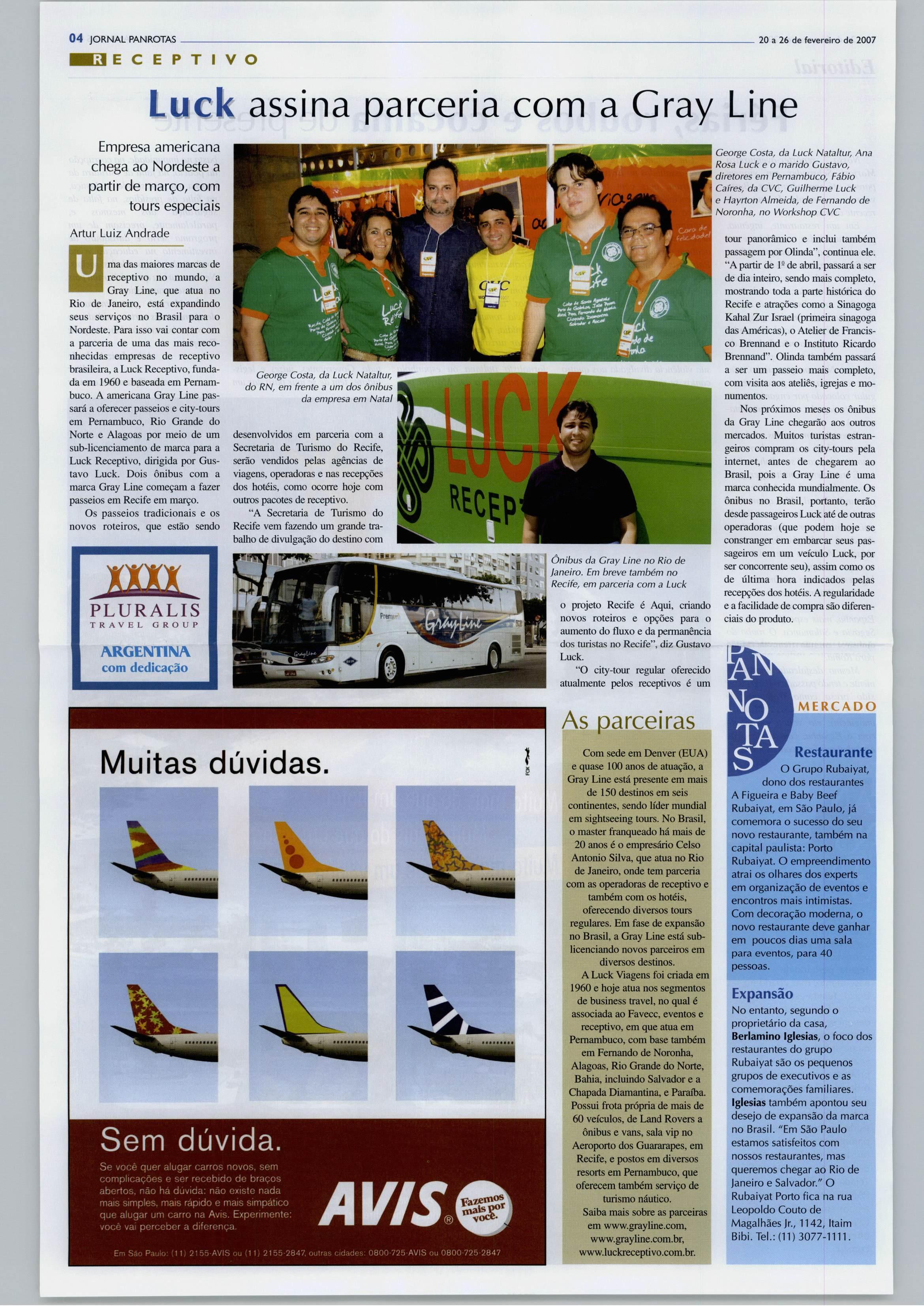 ma das maiores marcas de receptivo no mundo, a Gray Line, queatuano Rio de Janeiro, está expandindo seus serviços no Brasil parao Nordeste. Para isso vai contar com a parceria de uma das mais reco nhecidas empresas de receptivo brasileira, a Luck Receptivo, funda da em 1960 e baseada em Pemambuco.A americana GrayLinepas saráa oferecer passeios e city-tours em Pernambuco, Rio Grande do Norte e Alagoas por meiode um sub-licenciamento de marca para a Luck Receptivo,dirigidaporGus tavo Luck. Dois ônibus com a marcaGrayLine começam afazer passeios em Recife em março.