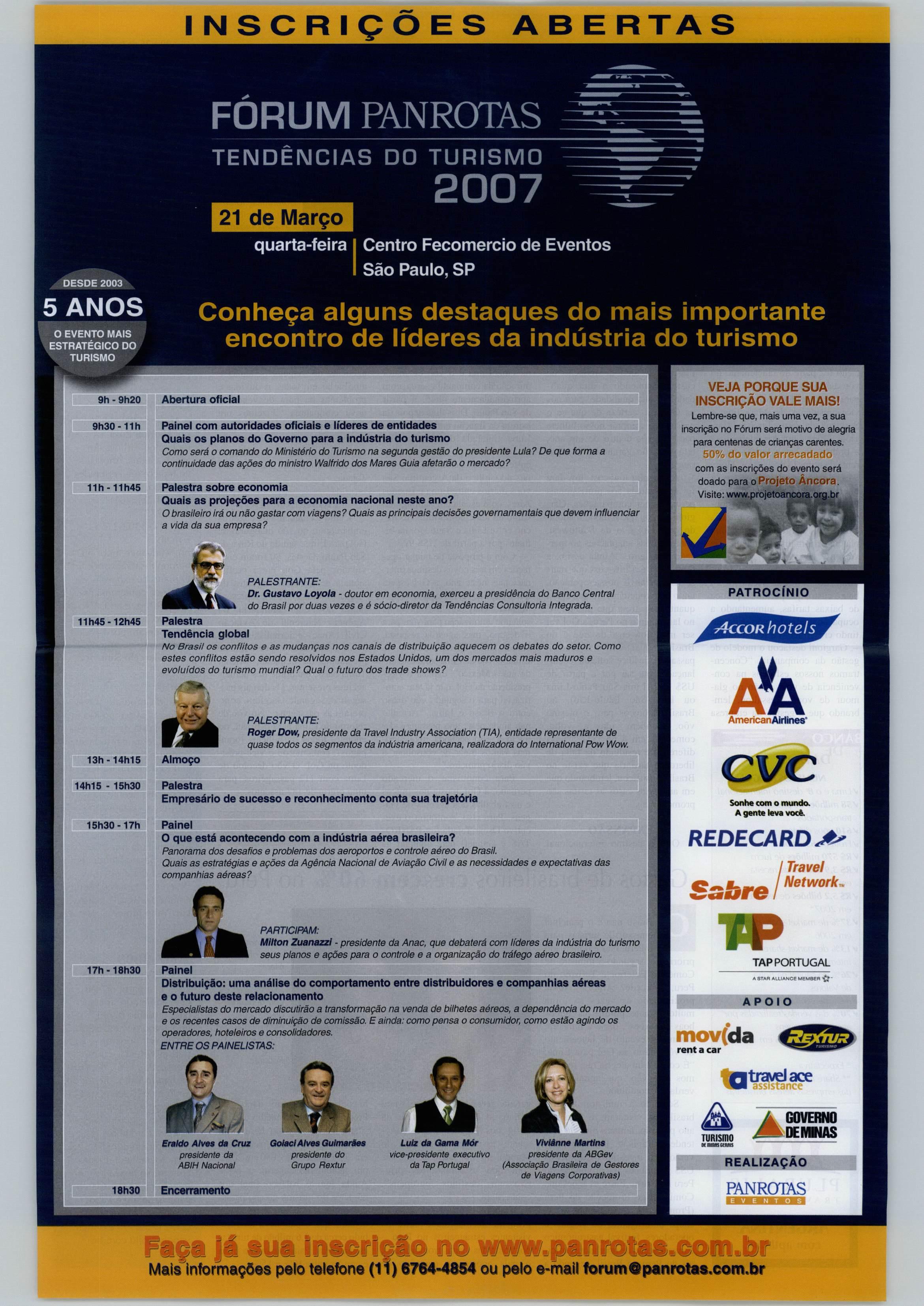 Ganhe mais com locações de carros nos EUA. D #1 L LA R NI AC A (11)5505-7300 doilar@dollarbr.com.br TA PANROTAS www. panrotas. com.br TRAVEL ACE INTERNATIONAL CERTIHCADO DE GARAKTIA www.travelace.coin.br Ano 15 -n® 744 20 a 26 de fevereiro de 2007 R$ 8,00 Luck leva Cray Linepara o Nordeste Gustavo Luck explica como vai funcionarparceriainéditaPágina04 Recife apresenta estudo sobre turismo de negócios 12 "Violência e burocracia tiram Sea Dream do Brasil Crutser llKHiS itiliS i^^^^iifíniiiriifiTi RICO TfíM T£am> TOm TRIP www.rexturcom.br m (11)5154-1010 webyef ^ va.rig com a Varig? Abav e Gol retomam diálogo São muitos os interessados em comprar a companhia. A Lan éaúnicaa assumir publicamente. Leia entrevista com Guilherme Laager, opresidenteda Nova Varig Página16 João Martins e Tarcísio Gargioni conversam, mas