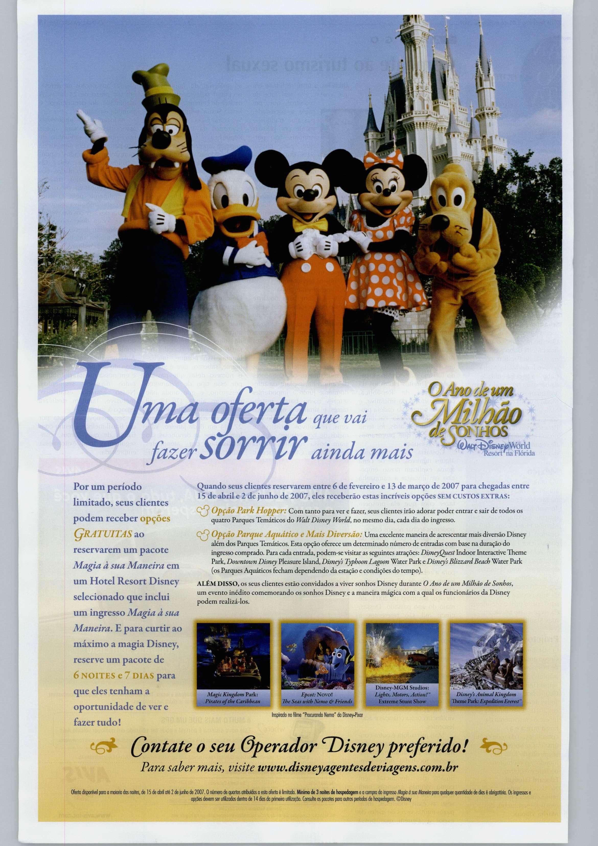 Ala^ic Kmgdom Park: Caribbean Epcot: Novo! inspirado no fiime "Procurando Nemo" {to Disney-Pixor Disney-MGM Scudios: Li^ts, Motors, AcHont" Disney's Animal Kingdom Theinc Expedititm Everest' (pntate o seu Operador l^isney preferido! Para saber mais, visite wwtv.disneyagentesdeviagens.com.br Oferto disponívei para o maioria dos noites, de i5de abril ots 2de junho de 2007.0 númeni de quartos otiibuídos oesto (^erlo é ^mitodo. Mínimo de 3 noites de hospedagem eocompra do irtgresso Magia òsua opções devem ser unlzodos dentro de 14 dios da primeím utilização. Consulte os pacotes para outros períodos de l)ospeiiagerr. ©Disney