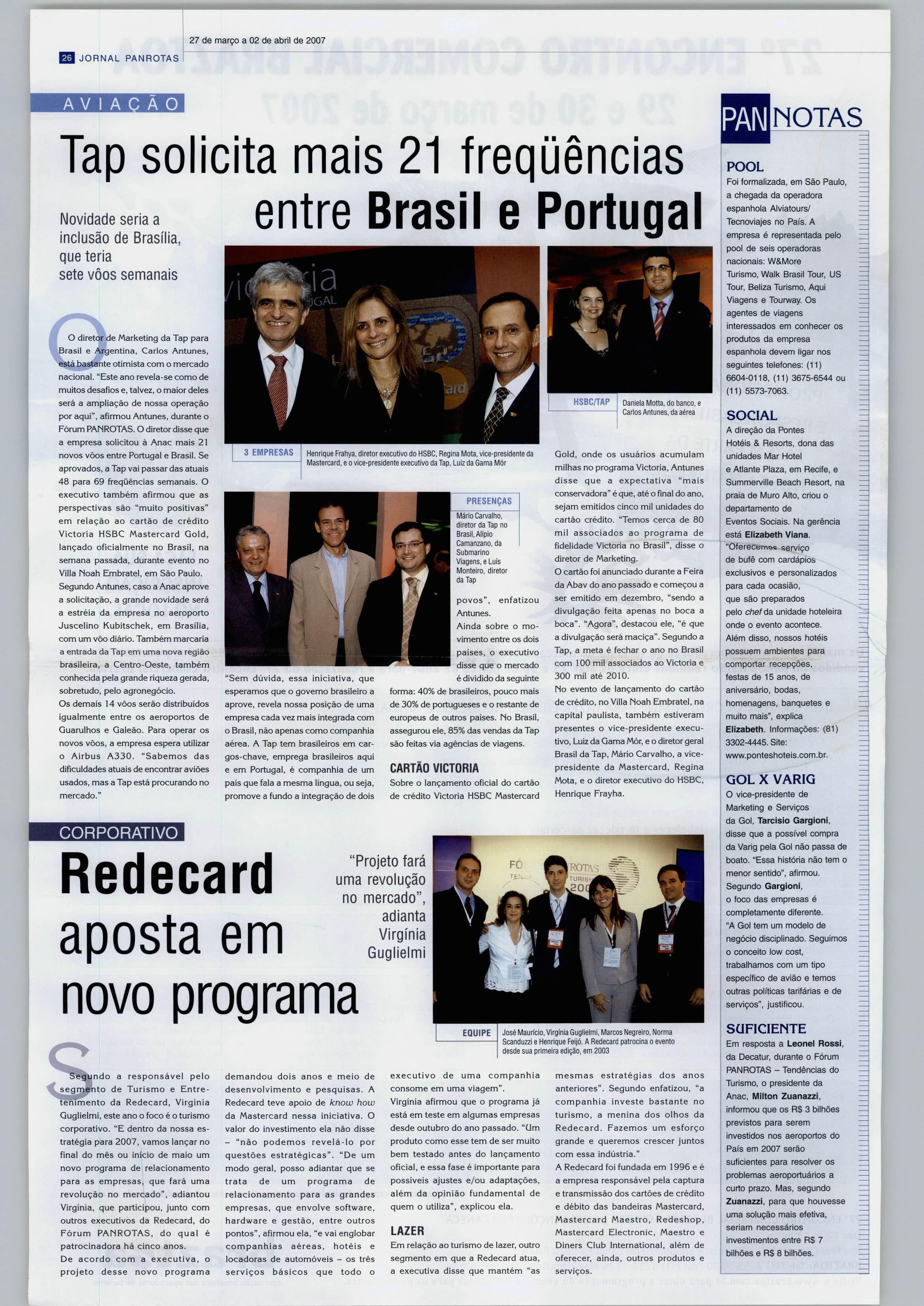 O cartão foi anunciado durante a Feira da Abav do ano passado e começou a ser emitido em dezembro, "sendo a divulgação feita apenas no boca a boca". "Agora", destacou ele, "é que a divulgação será maciça". Segundo a Tap,a meta é fechar o ano noBrasil com 100 mil associados ao Victoria e 300 mil até 2010. No evento de lançamento do cartão de crédito, no Villa Noah Embratel, na capital paulista, também estiveram presentes o vice-presidente execu tivo,Luizda Gama Mór,eo diretor geral Brasil da Tap, Mário Carvalho, a vicepresidente da Mastercard. Regina Mota, eo diretor executivo do HSBC, Henrique Frayha.