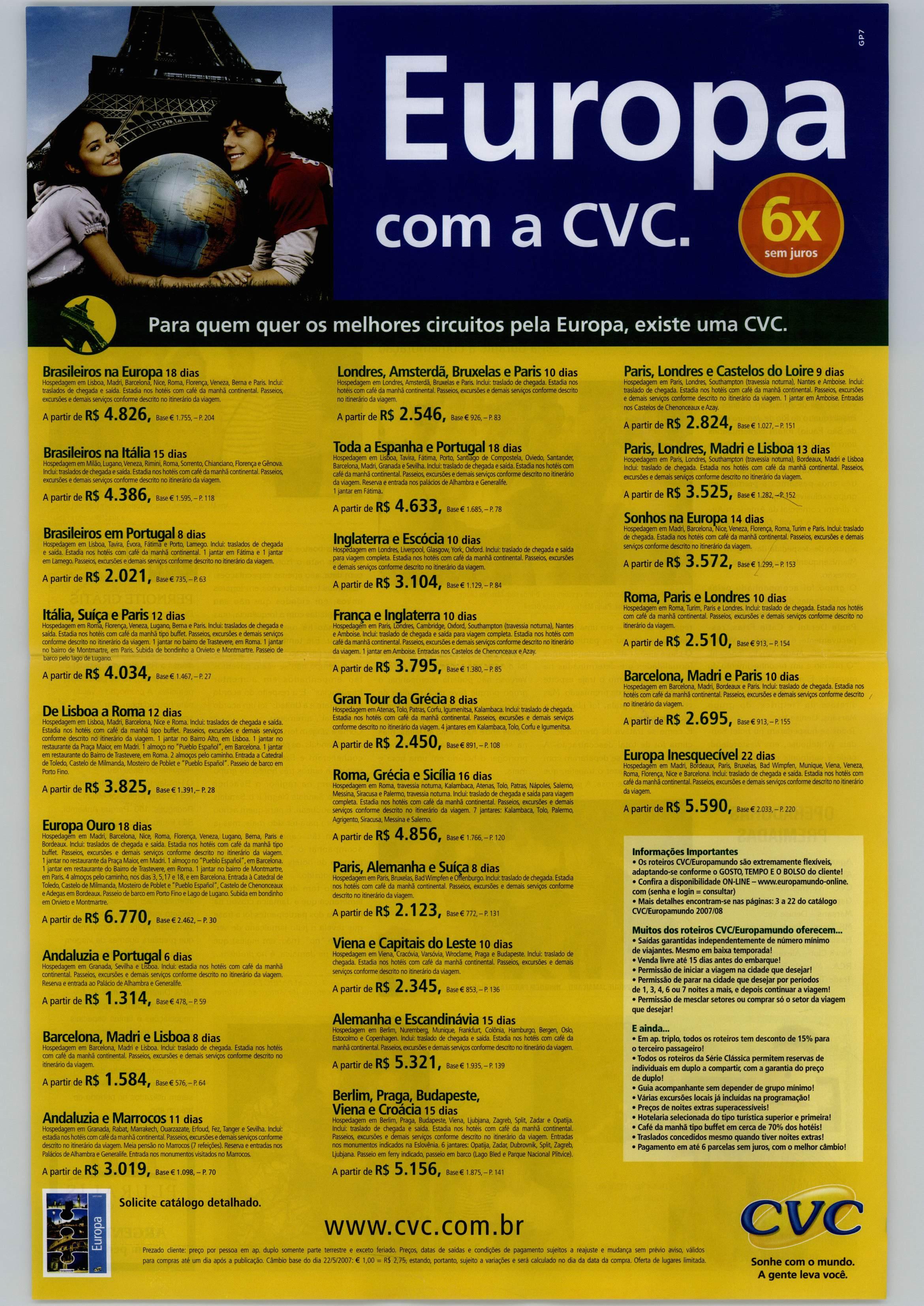 3,023) RS 908 + 9x RS 235 Nolas: Pi£ÇO$ por pessoa em i;atiine.'ãpIo. dupln saindu deSâo Paula, válidas pjrj dalHddpuülicaçãa, suieiios adisponipllidade eaiteraçSo sem pré'/iciavi50 Nãoincluemlaias po'iuSriaF.as'apanuafiK s ct?f.erviço Prc(asfBteienciaiSE\êrâo convertidos em Raais nadatado paQto PsrcelamfinlQ fliclusivo MatterCanf válidopara paglos stí 3Q/06/D7. Cruultos e Skl pagamento em cheque.Preçot nâo viildss para terlados. ToarcomGula desde o Bisill mínimo 20 (issiobs.