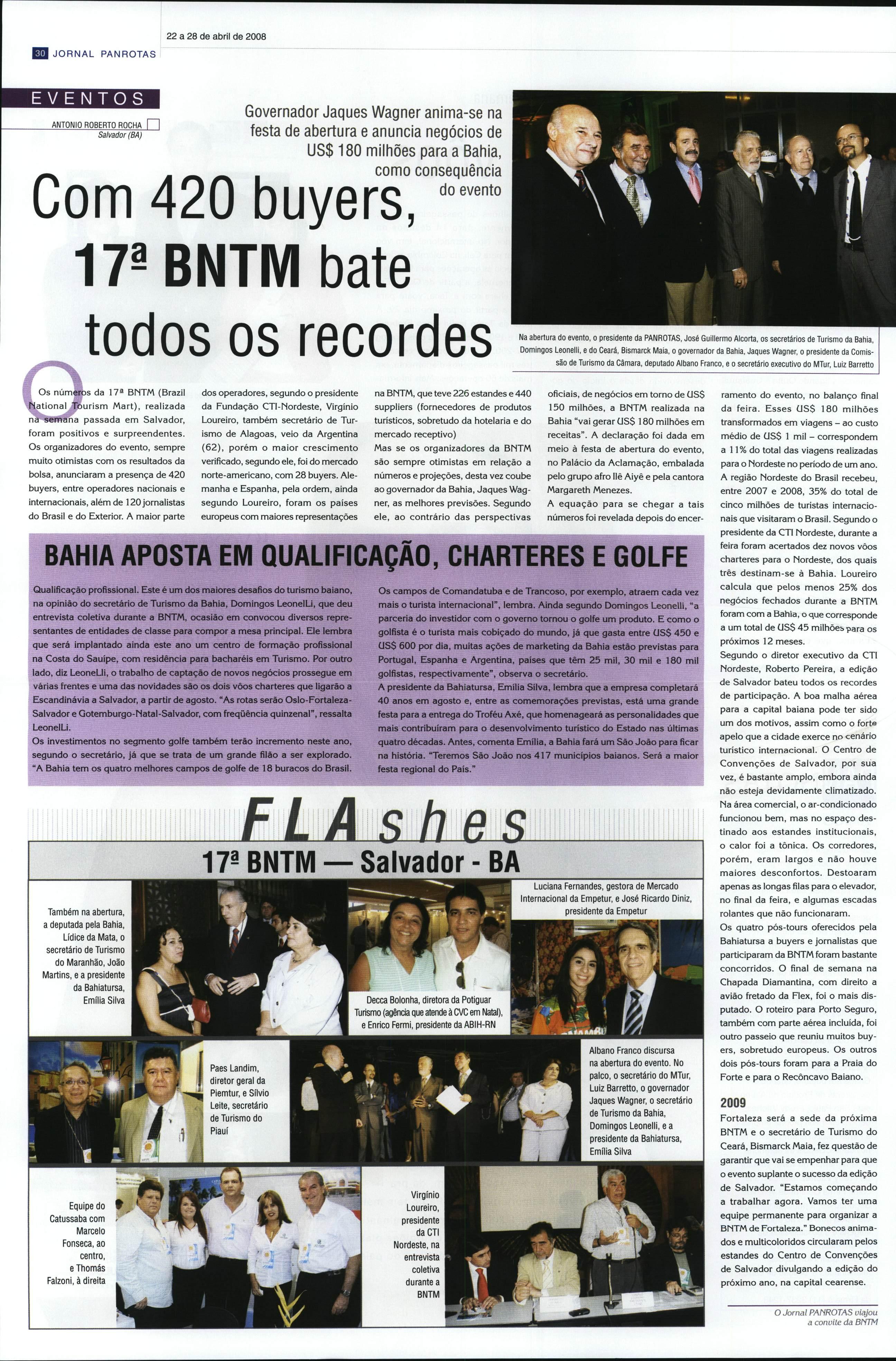 Os númfÊbs da 17^ BNTM (Brazil itionai Aurism Mart), realizada nff^wiwrna passada em Salvador, foram positivos e surpreendentes. Os organizadores do evento, sempre muito otimistas com os resultados da bolsa, anunciaram a presença de 420 buyers, entre operadores nacionais e internacionais, além de 120 jornalistas doBrasiledoExterior.A maior parte