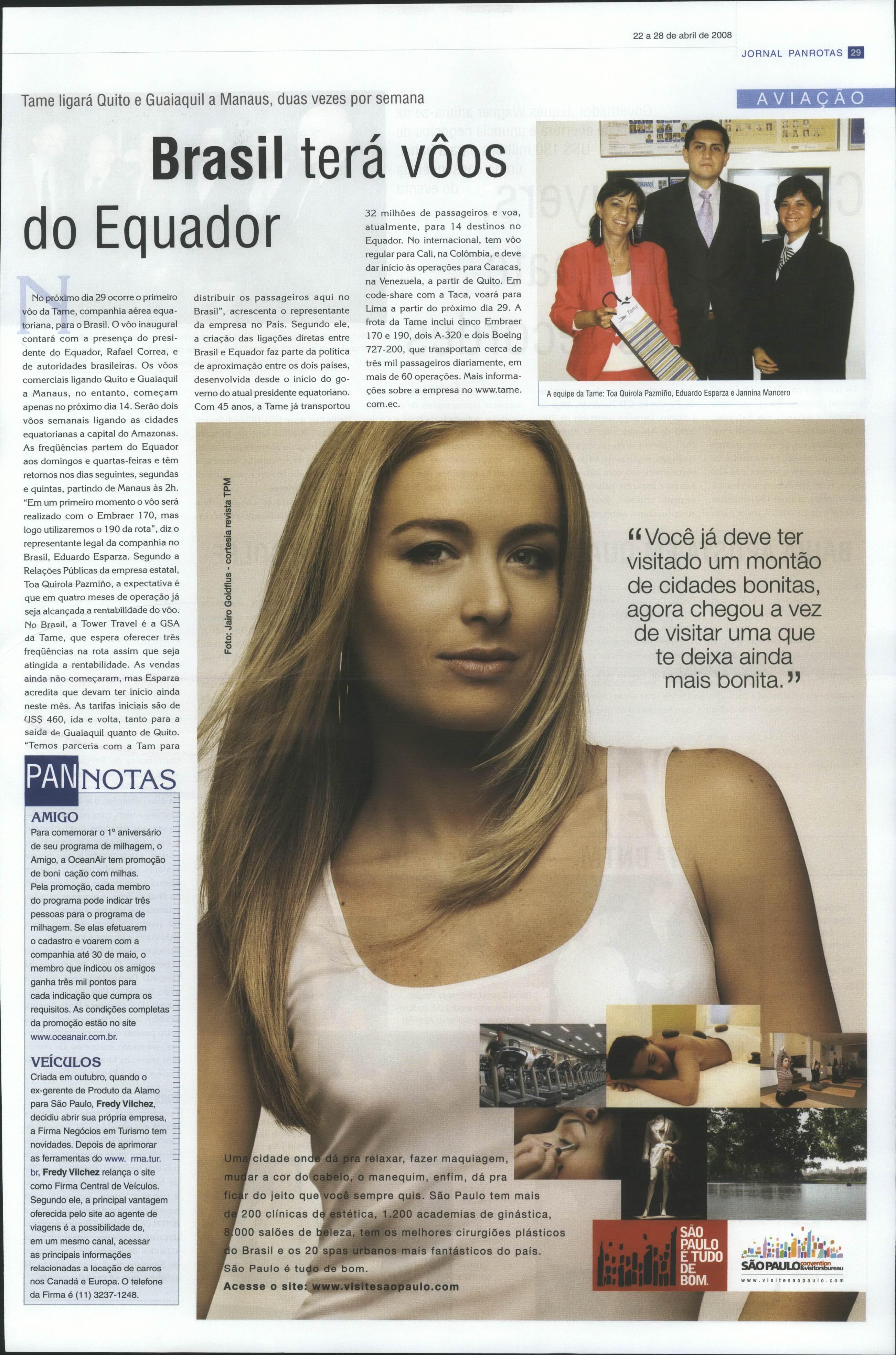distribuir os passageiros aqui no Brasil", acrescenta o representante da empresa noPaís. Segundo ele, a criação das ligações diretas entre Brasile Equador faz parte da política de aproximação entre osdois países, desenvolvida desde o início do go verno do atual presidente equatoriano. Com 45 anos, a Tame já transportou
