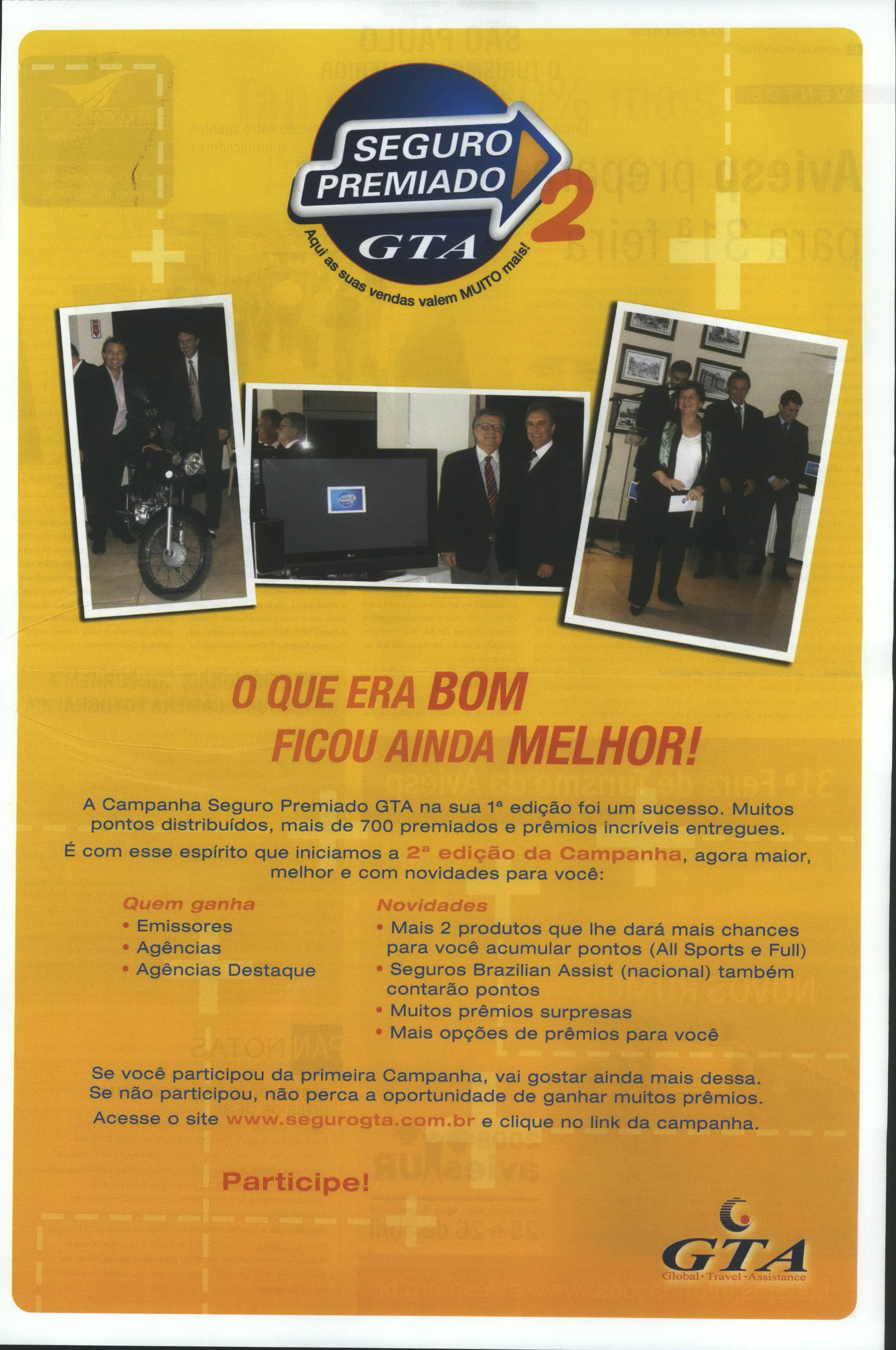 A Campanha Seguro Premiado GTA na sua 1® edição foi um sucesso. Muitos pontos distribuídos, mais de 700 premiados e prêmios incríveis entregues. Écom esse espírito que iniciamos a 2® edsção da Campanha, agora maior, melhor e com novidades para você; Quem ganha