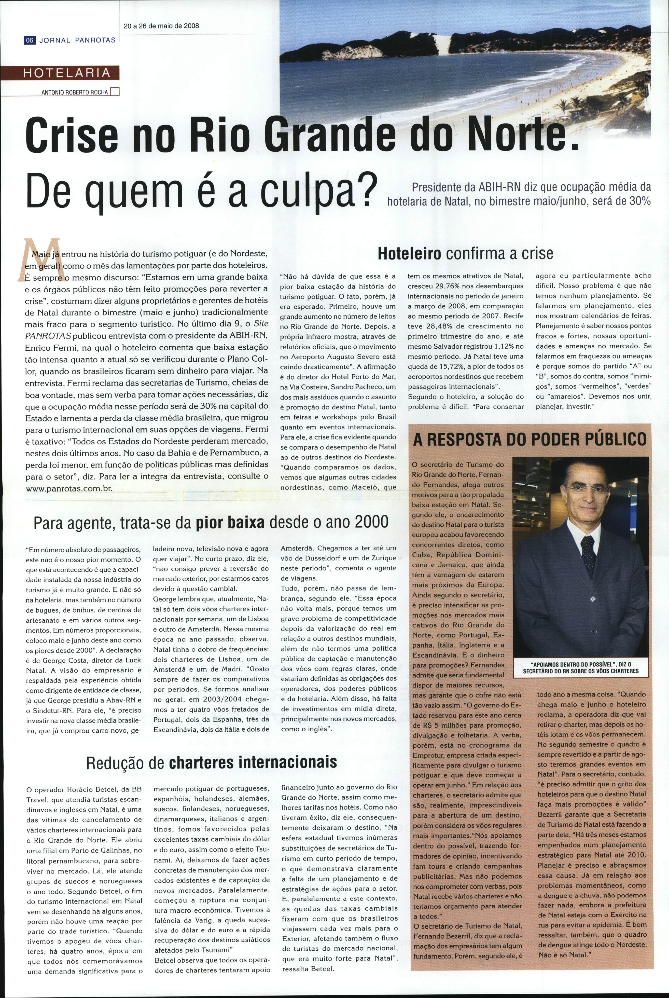 tem os mesmos atrativos de Natal, cresceu 29,76% nos desembarques internacionais no período de janeiro a março de 2008, em comparação ao mesmo período de 2007. Recife teve 28,48% de crescimento no primeiro trimestre do ano, e até mesmo Salvador registrou 1,12% no mesmo período. Já Natal teve uma queda de 15,72%, a pior de todos os aeroportos nordestinos que recebem passageiros internacionais". Segundo o hoteleiro, a solução do problema é difícil. "Para consertar