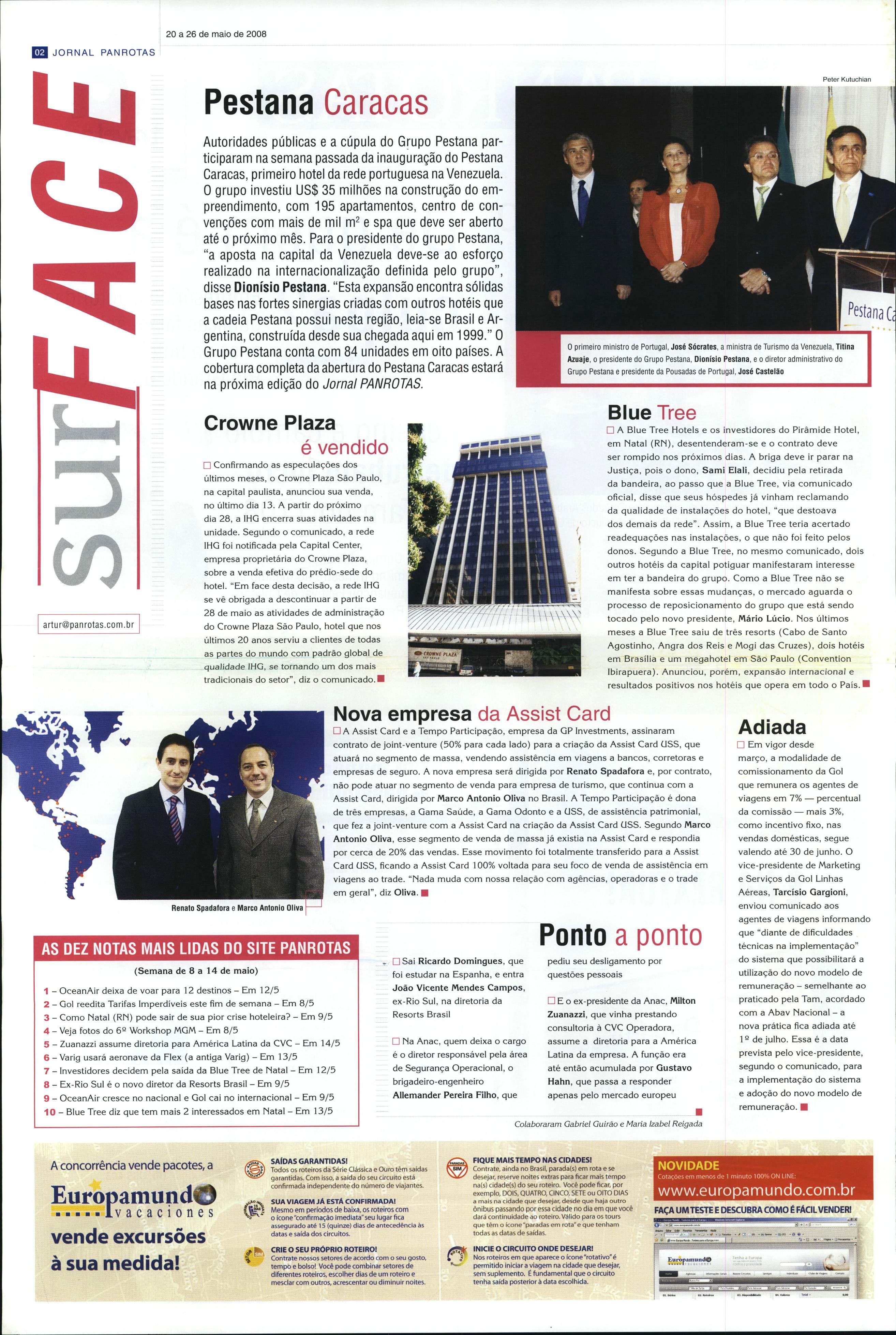 Autoridades públicaseacúpulado Grupo Pestanapar ticiparamnasemana passada dainauguraçãodoPestana Caracas,primeirohoteldaredeportuguesana Venezuela. Ogrupo investiu US$ 35milhõesnaconstruçãodoem preendimento, com195apartamentos,centrodecon vençõescommaisde mil m^ espaquedeveseraberto atéopróximomês.ParaopresidentedogrupoPestana, "aapostanacapitalda Venezuela deve-seaoesforço realizadonainternacionalizaçãodefinidapelogrupo", disseDionísio Pestana. "Estaexpansãoencontrasólidas basesnasfortessinergiascriadascomoutroshotéisque acadeiaPestanapossuinesta região, leia-se Brasil e Ar gentina, construídadesdesuachegada aqui em 1999." O Grupo Pestanacontacom84 unidades em oito países.A coberturacompletadaaberturadoPestana Caracas estará na próxima ediçãodoJornal PANROTAS.