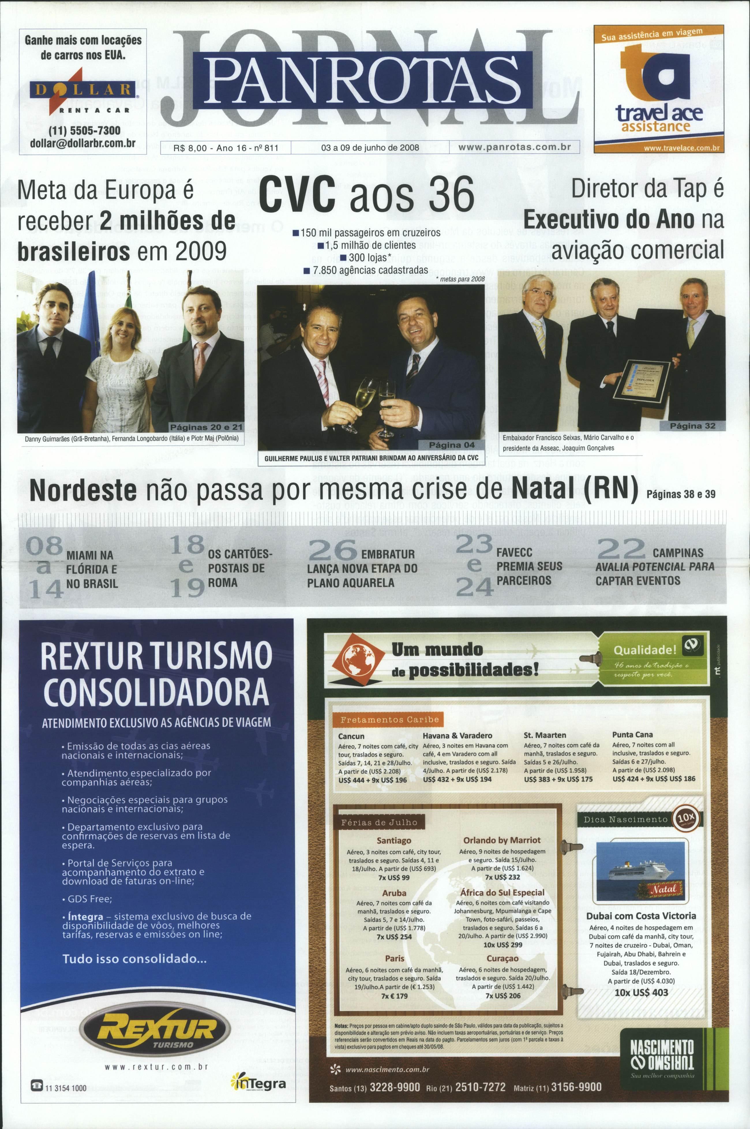 Sobre a crise ricfa^ieira que Natal atraves sa, o presidente da Auh.qe diz que, mesmo à distância, considere ^ue o problemapodeestarnaquedadofluxo internacional,jáqueodestinoavançou multo nesse segmento. "Sinceramente, não sabia que Natal estava atraves sando um momento tão delicado. Foi uma surpresa para mim. Para nós. Natal sempre foi referência de sucesso. Sempre usamos as ações deNatal para alertar nossos governantes de que ovizinho está no bom caminho e não podemos ficar para trás.A queda no número de charteres intemacionais afetou o destino" continua na página 39