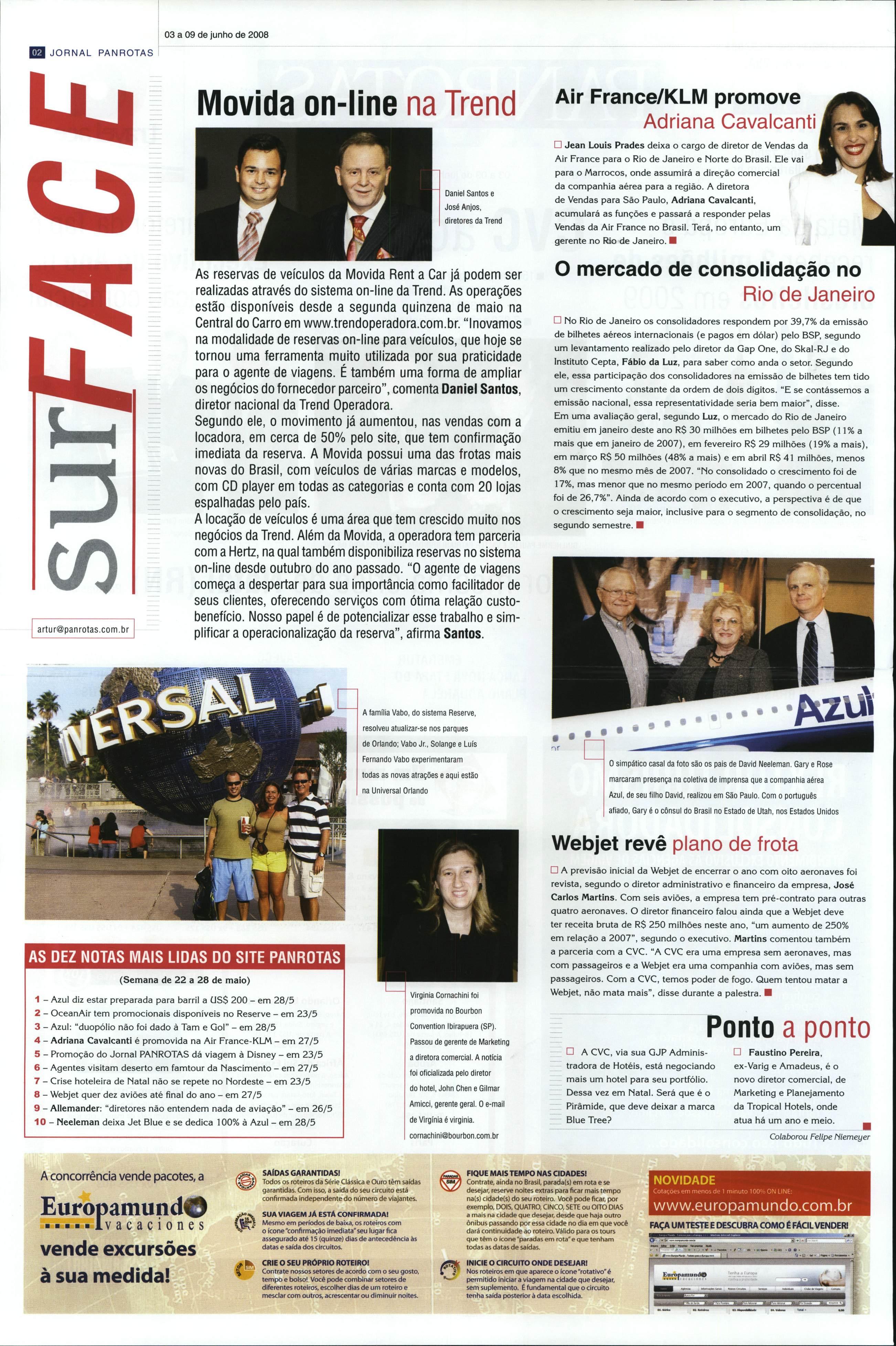 •A previsão inicialdaWebjetde encerrar o ano com oito aeronaves foi revista, segundo o diretor administrativo e financeiro da empresa, José Carlos Martins. Comseisaviões,a empresa tem pré-contrato para outras quatro aeronaves. O diretor financeiro falou ainda que a Webjet deve ter receita bruta deR$ 250 milhões neste ano, "um aumento de250% em relação a 2007", segundo o executivo. Martins comentou também a parceria com aCVC."ACVCera uma empresa sem aeronaves, mas com passageiros ea Webjet era uma companhia com aviões, mas sem passageiros. ComaCVC, temos poder defogo. Quem tentou matar a Webjet, não mata mais", disse durante a palestra. •