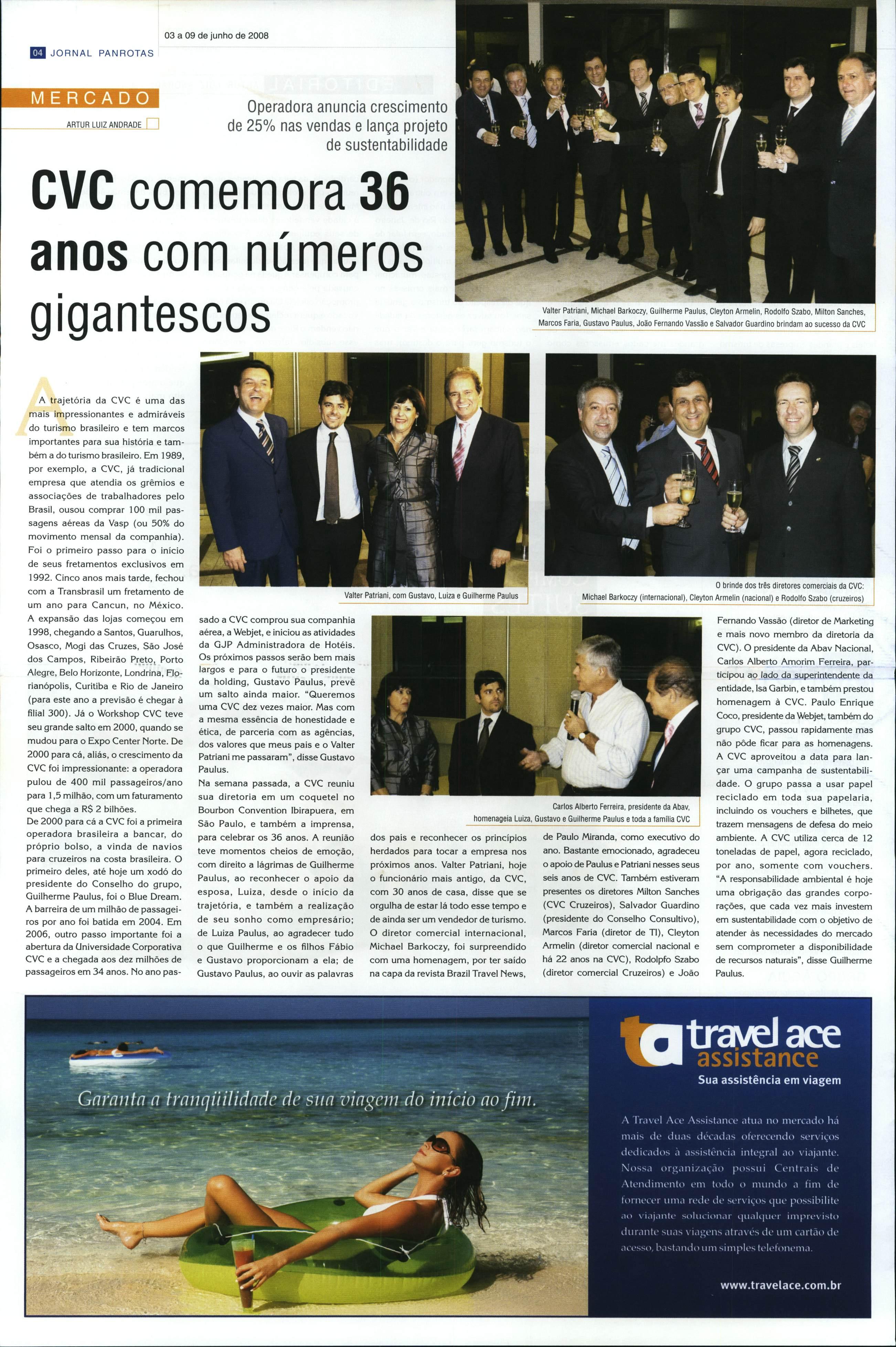 dos pais e reconhecer os princípios herdados para tocar a empresa nos próximos anos. Valter Patriani, hoje o funcionário mais antigo, daCVC, com 30 anos de casa, disse que se orgulha de estar lá todo esse tempo e de ainda ser um vendedor de turismo. O diretor comercial internacional, Michael Barkoczy, foi surpreendido com uma homenagem, por ter saído na capa da revista Brazil Travei News,