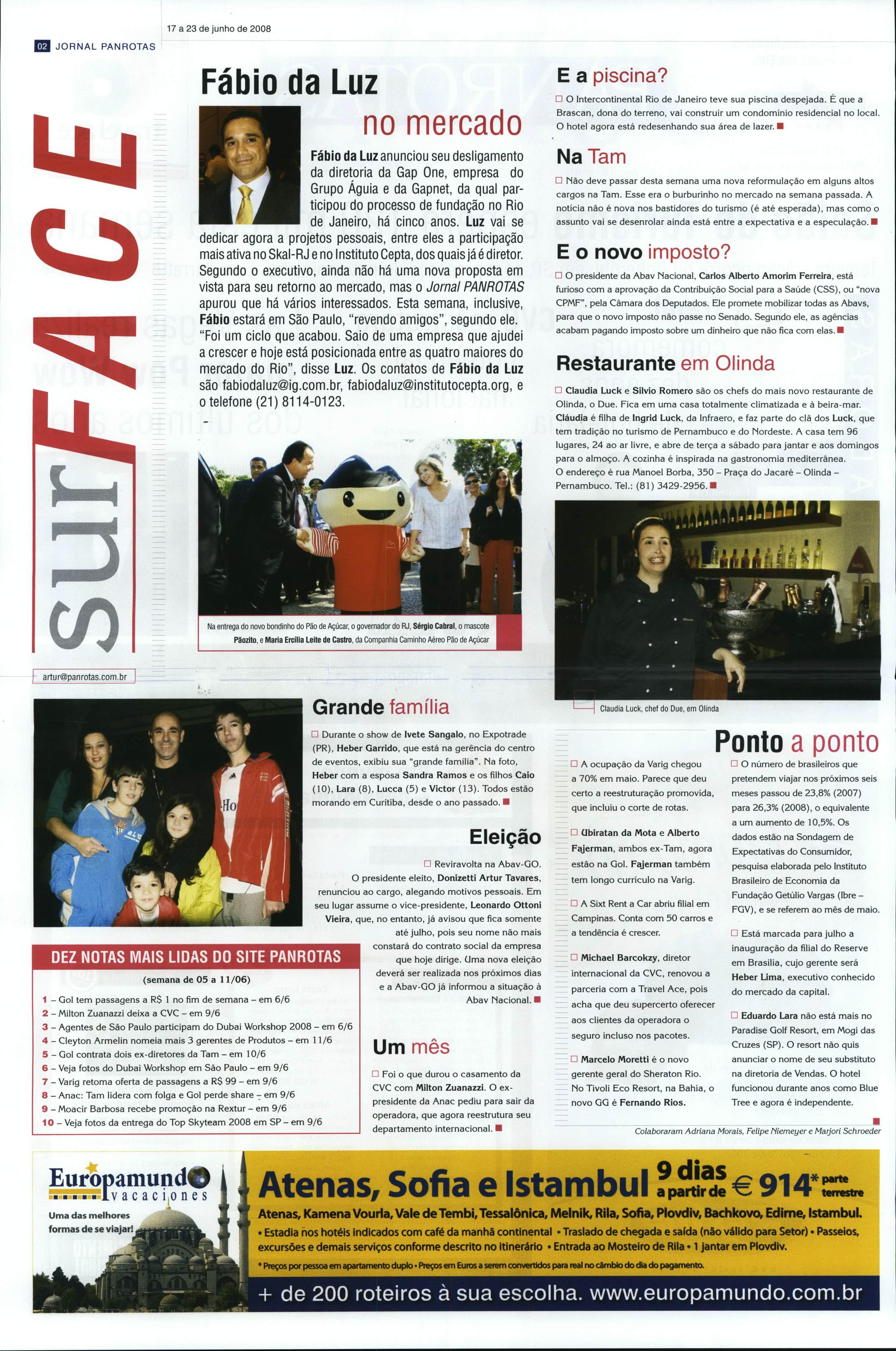 Fábioda Luz anunciouseudesligamento dadiretoriada Gap One, empresado Grupo Águia e da Gapnet, da qual pari ticipou do processo de fundação no Rio de Janeiro, liá cinco anos. Luzvai se dedicaragoraaprojetospessoais,entreelesa participação maisativano Skal-RJ enoInstitutoCepta,dosquaisjáédiretor. Segundooexecutivo,aindanãoháumanova proposta em vistaparaseuretornoaomercado,masoJorna/ PANROTAS apurouquehávários interessados. Estasemana, inclusive, Fábio estará emSãoPaulo,"revendoamigos", segundo ele. "Foi umcicloqueacabou.Saiodeuma empresa queajudei a crescer ehojeestáposicionadaentreasquatromaioresdo mercado doRio", disse Luz.Os contatos de Fábio daLuz sãofabiodaluz@ig.com.br, fabiodaluz@institutocepta.org, e otelefone (21)8114-0123.