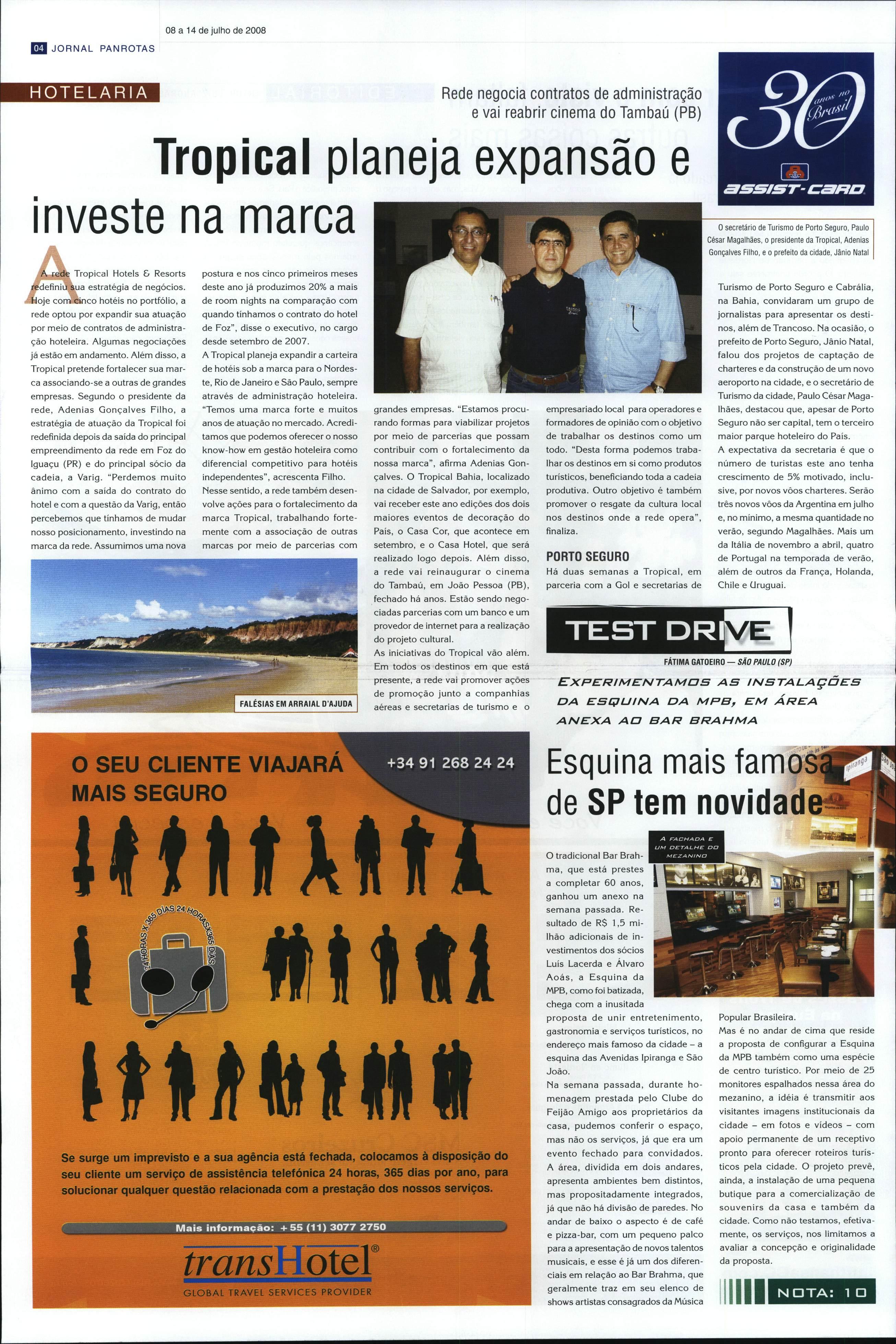 grandes empresas. "Estamos procu rando formas para viabilizar projetos por meio de parcerias que possam contribuir com o fortalecimento da nossa marca", afirma Adenias Gon çalves. O Tropical Bahia, localizado na cidade de Salvador, por exemplo, vai receber este ano edições dos dois maiores eventos de decoração do País, o Casa Cor, que acontece em setembro, eo Casa Hotel, que será realizado logo depois. Além disso, a rede vai reinaugurar o cinema do Tambaú, em João Pessoa (PB), fechado há anos. Estão sendo nego ciadas parcerias com um banco e um provedor de internet para a realização do projeto cultural. As iniciativas do Tropical vão além. Em todos os destinos em que está presente, a rede vai promover ações de promoção junto a companhias aéreas e secretarias de turismo eo