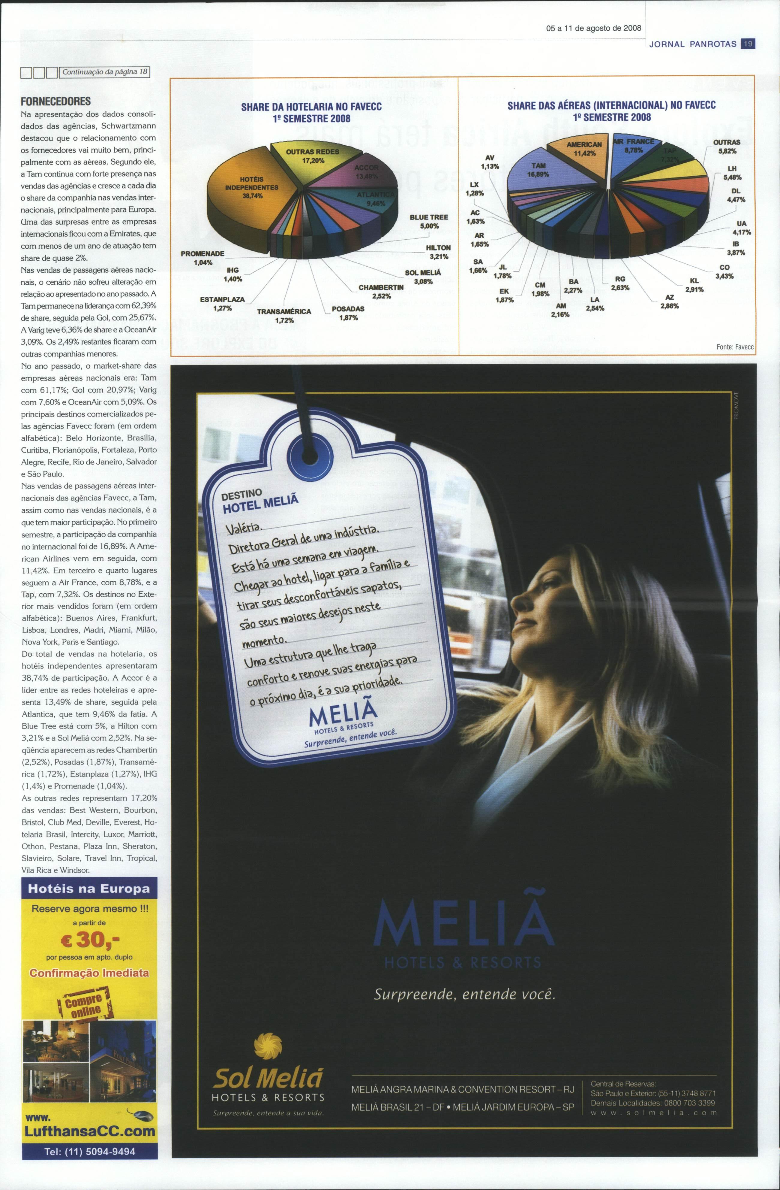 relatado por Ana Nery, responsável pelas vendas no Sheraton Barra. "Em junho percebemos que a demanda para julho não seria como nos últi mos anos, então tivemos que fazer uma grande ação de pré-venda". As reservas nacionais de última hora fizeram com que eles chegassem ao bom número de 65%.