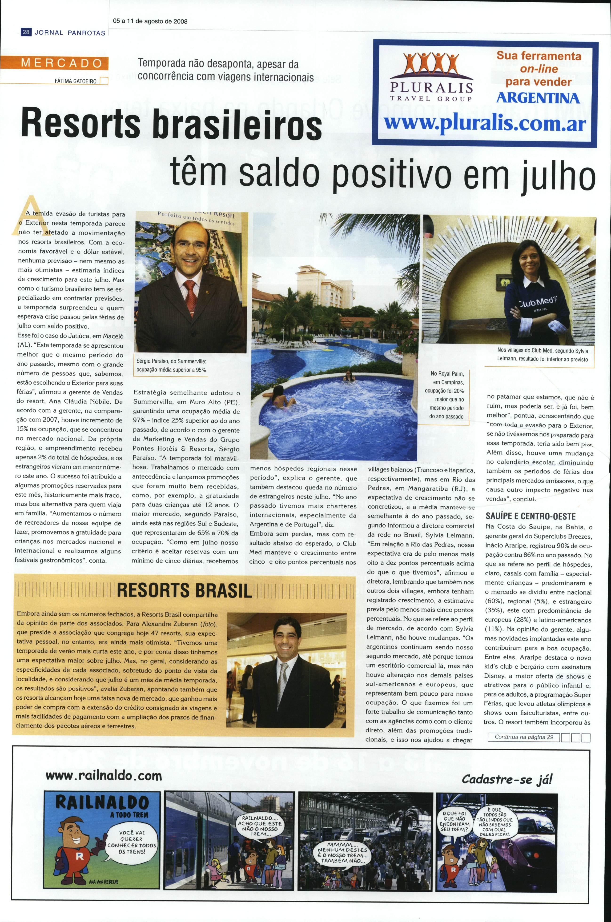 Hotel Resort, localizado em Campi nas, no interior do Estado. Na opinião do diretor comercial da rede, Ricardo Aly, as temperaturas mais altas neste inverno também favoreceram. O resort manteve 60% de ocupação, 20%a mais do que obteve em 2007, resultado atribuído também á con solidação de atrações relativamente novas, como o Parque Katakuka. Ricardo Aly não vêa concorrência do internacional como grande ameaça. "Em julho, ofortedo internacional são as estações de esqui, mas o brasileiro, tradicionalmente, compra pacotes de no máximo uma semana, eo restante das férias ele passa em destinos mais próximos de casa", pondera Aly.