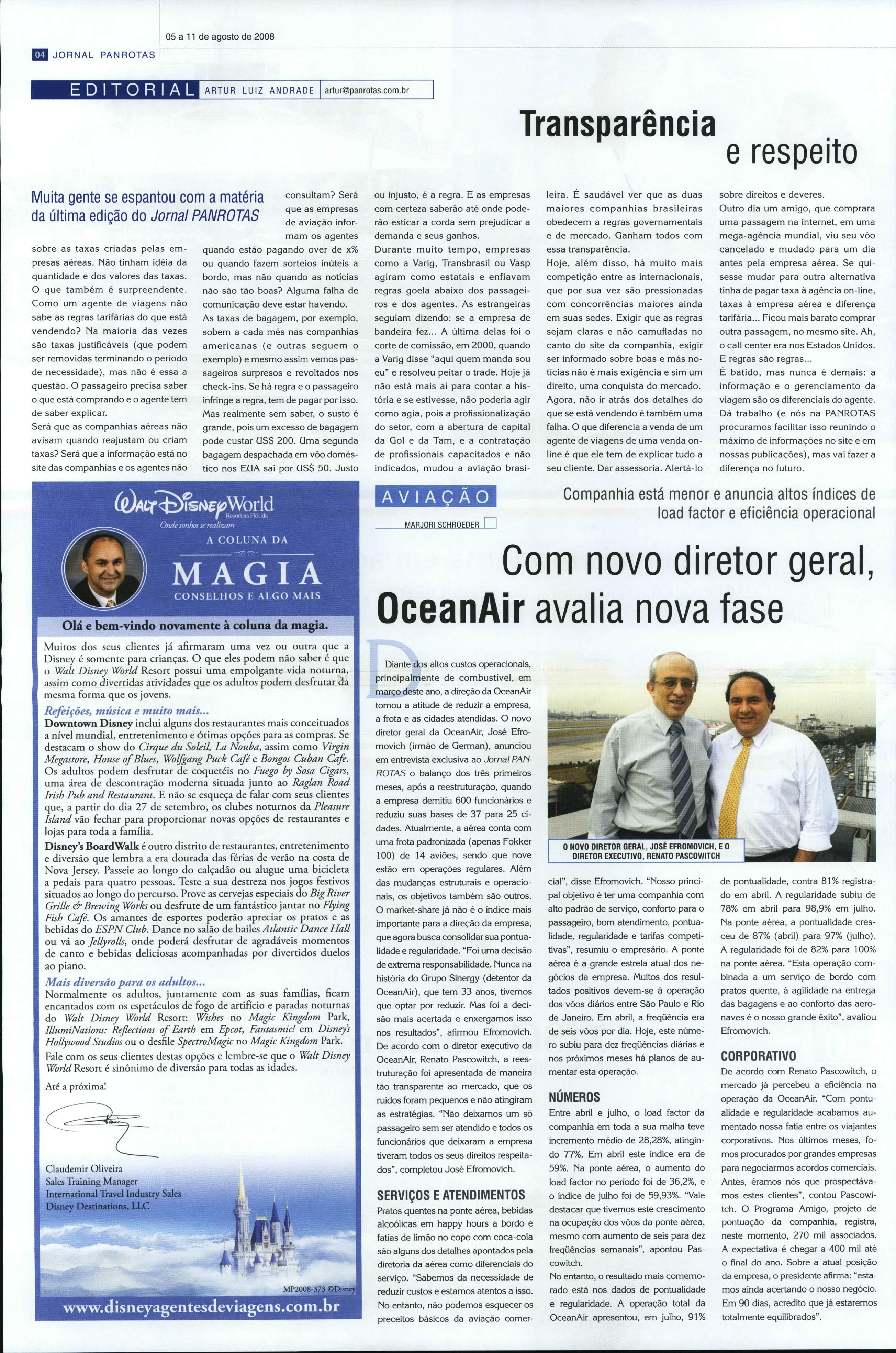 De acordo com Renato Pascowitch, o mercado já percebeu a eficiência na operação daOceanAir. "Compontu alidade e regularidade acabamos au mentado nossa fatia entre os viajantes corporativos. Nosúltimos meses, fo mos procurados por grandes empresas para negociarmos acordos comerciais. Antes, éramos nós que prospectávamos estes clientes", contou Pascowi tch.O Programa Amigo,projetode pontuação da companhia, registra, neste momento. 270 mil associados. A exF)ectativa é chegar a 400 mil até ofinal do ano. Sobre a atual posição da empresa, o presidente afirma: "esta mos ainda acertando o nosso negócio. Em 90 dias, acredito que já estaremos totalmente equilibrados".