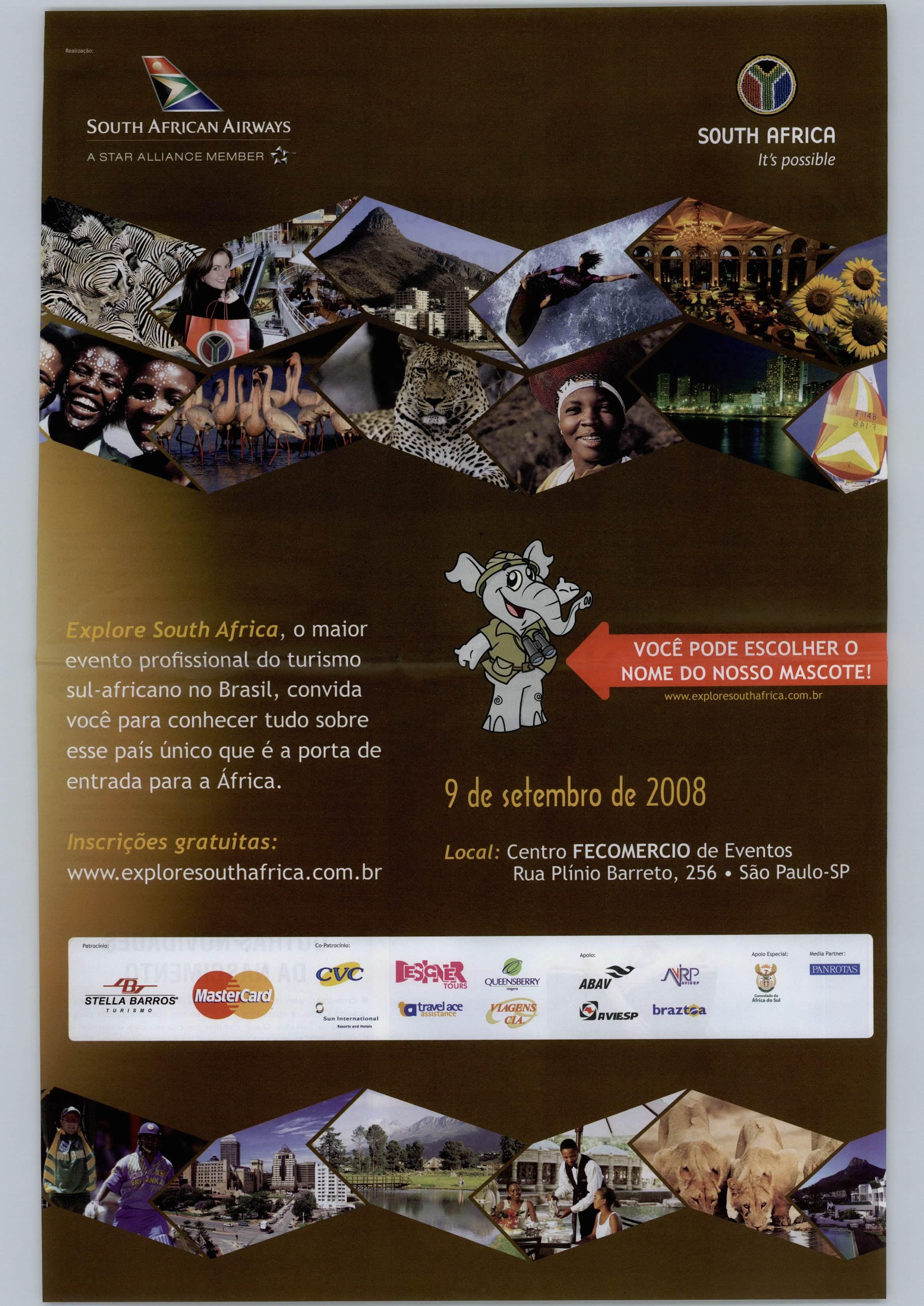 outrospaísesda África, comoCape Town Routes ÍJnlimited, Gauteng Tourism, Johannesburg Tourism, LImpopo Tourism, Nelson Madela Bay, Mamibia Tourism Board eMauritius Tourism Promotion Authoroty, além do South Afrícan Tourism, rea lizador do evento junto com a South African Airways. Além da feira de negócios, haverá, como nos anos anteriores, um ciclo de seminários, com especialistas no des tino. Confira a programação ao lado e programe, desde já, sua participação no Explore South África 2008. Mais informações e inscrições no www.exploresouthafrica.com.br.