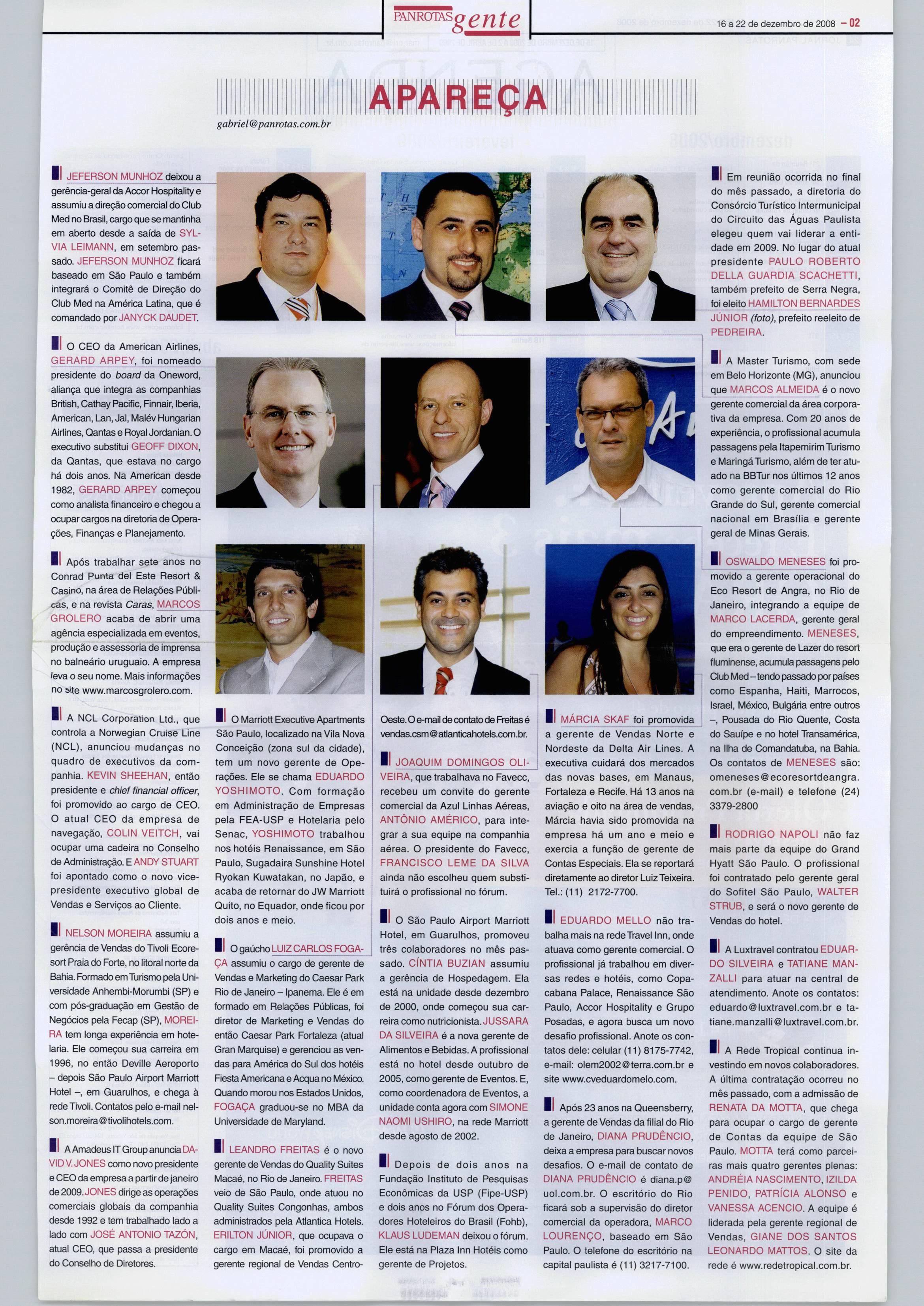 IIARede Tropical continua in vestindo em novos colaboradores. A última contratação ocorreu no mês passado, com a admissão de RENATA DA MOTTA, que chega para ocupar o cargo de gerente de Contas da equipe de São Paulo. MOTTA terá como parcei ras mais quatro gerentes plenas: ANDRÉIA NASCIMENTO, IZILDA PENIDO, PATRÍCIA ALONSO e VANESSA AGENCIO. A equipe é liderada pela gerente regional de Vendas, GIANE DOS SANTOS LEONARDO MATTOS. O site da rede é www.redetropical.com.br.