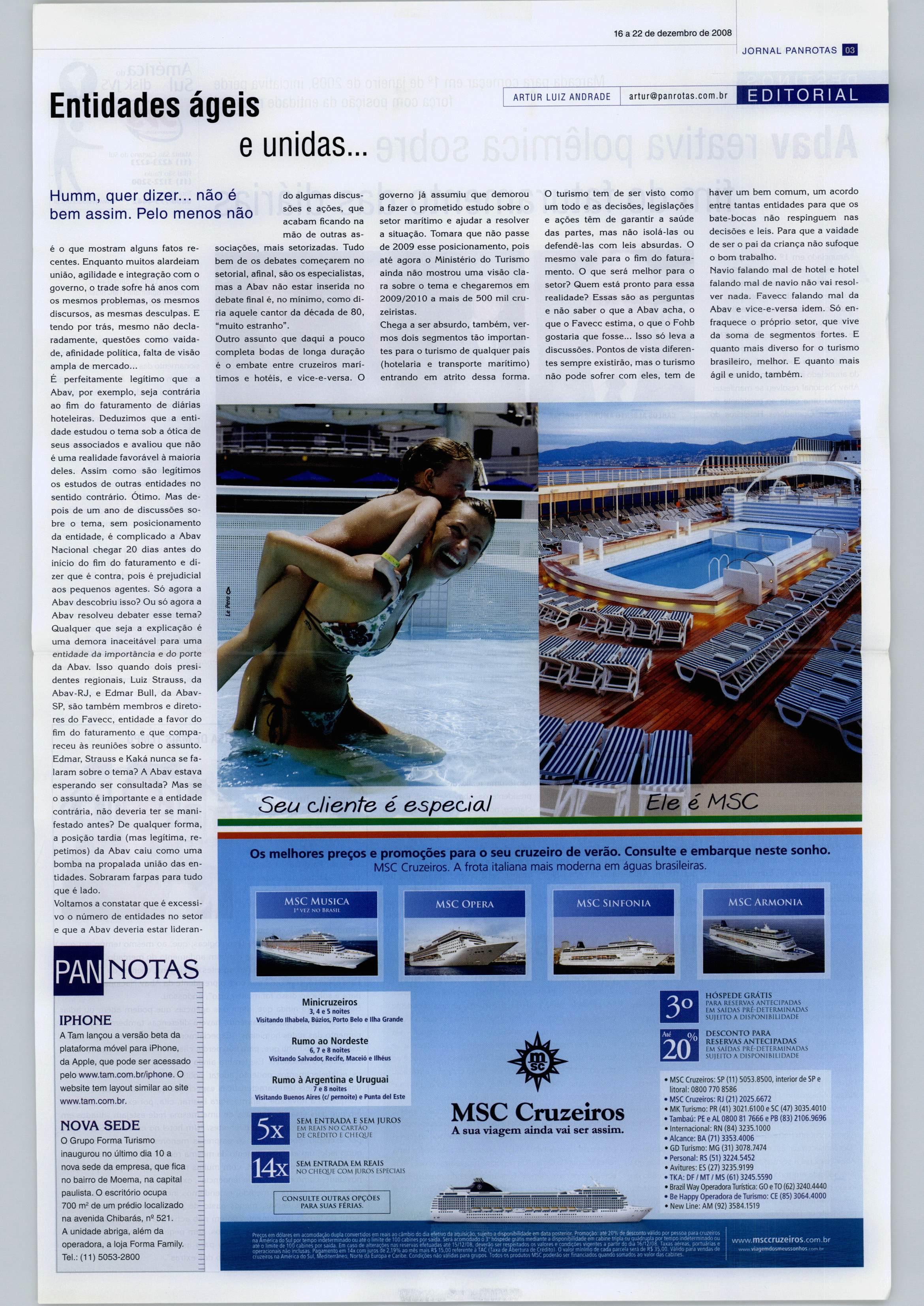 O turismo tem de ser visto como um todo e as decisões, legislações e ações têm de garantir a saúde das partes, mas não isolá-las ou defendê-las com leis absurdas. O mesmo vale para ofim do fatura mento. O que será melhor para o setor? Quem está pronto para essa realidade? Essas são as perguntas e não saber o que a Abav acha, o que o Favecc estima, o que o Fohb gostaria que fosse... Isso sólevaa discussões. Pontos de vista diferen tes sempre existirão, mas o turismo não pode sofrer com eles, tem de haver um bem comum, um acordo entre tantas entidades para que os bate-bocas não respinguem nas decisões e leis. Para que a vaidade deseropaida criança não sufoque o bom trabalho. Navio falando mal de hotel e hotel falando mal de navio não vai resol ver nada. Favecc falando mal da Abav e vlce-e-versa idem. Só en fraquece o próprio setor, que vive da soma de segmentos fortes. E quanto mais diverso foro turismo brasileiro, melhor. E quanto mais ágile unido, também.