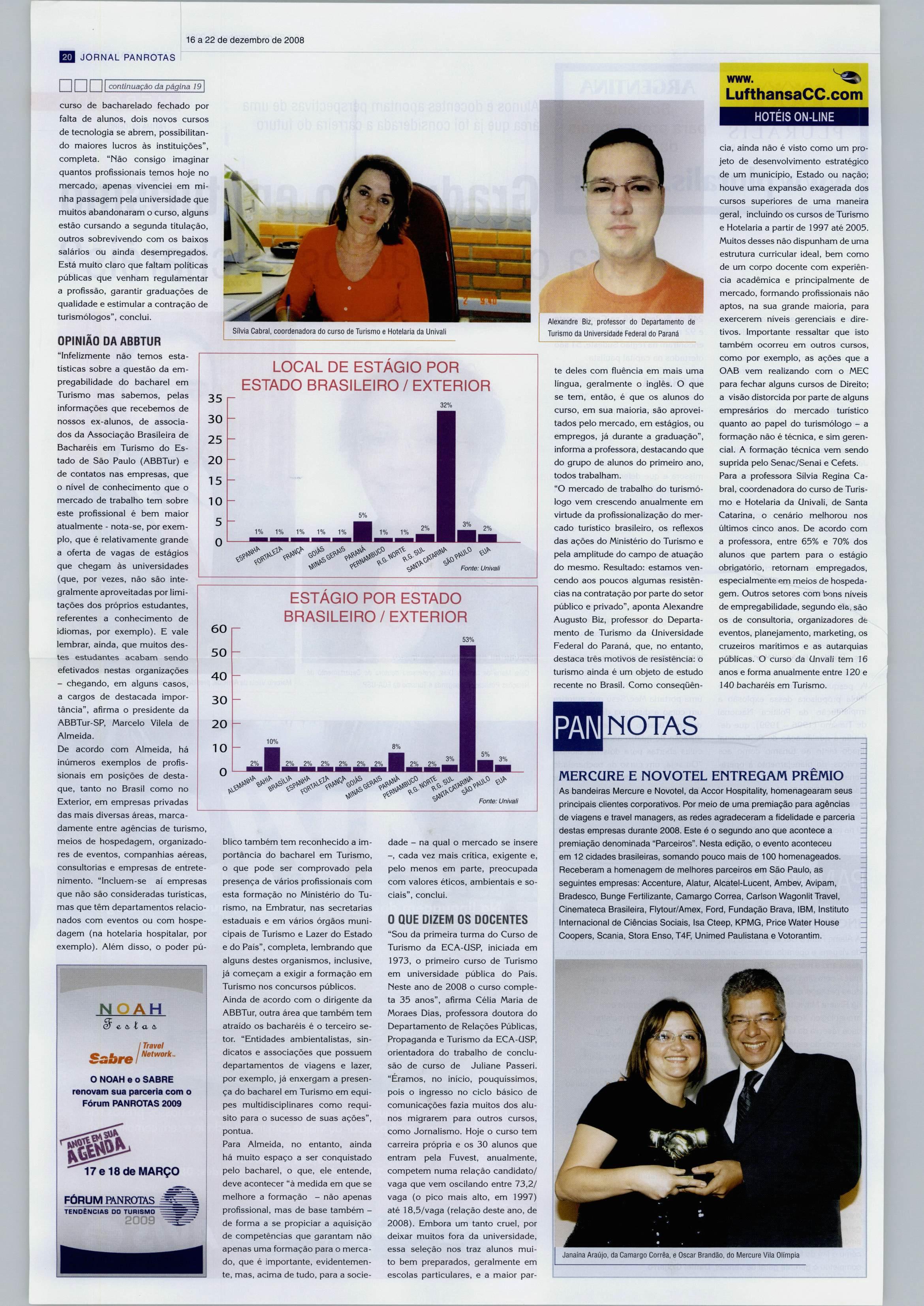 cia, ainda não é visto como um pro jeto de desenvolvimento estratégico de um município, Estado ou nação; houve uma expansão exagerada dos cursos superiores de uma maneira geral, incluindo os cursos de Turismo e Hotelaria a partir de 1997 até 2005. Muitos desses não dispunham de uma estrutura curricular ideal, bem como de um corpo docente com experiên cia acadêmica e principalmente de mercado, formando profissionais não aptos, na sua grande maioria, para exercerem níveis gerenciais e dire tivos. Importante ressaltar que isto também ocorreu em outros cursos, como por exemplo, as ações que a OAB vem realizando com o MEC para fechar alguns cursos de Direito; a visão distorcida por parte de alguns empresários do mercado turístico quanto ao papel do turismólogo -a formação não é técnica, e sim geren cial. A formação técnica vem sendo suprida pelo Senac/Senai e Cefets. Para a professora Sílvia Regina Ca bral, coordenadora do curso de Turis mo e Hotelaria da Univali, de Santa Catarina, o cenário melhorou nos últimos cinco anos. De acordo com a professora, entre 65% e 70% dos alunos que partem para o estágio obrigatório, retornam empregados, especialmente em meios de hospeda gem. Outros setores com bons níveis de empregabilidade, segundo ela, são os de consultoria, organizadores de eventos, planejamento, marketing, os cruzeiros marítimos e as autarquias públicas. O curso da (Jnvali tem 16 anos e forma anualmente entre 120 e 140 bacharéis em Turismo.