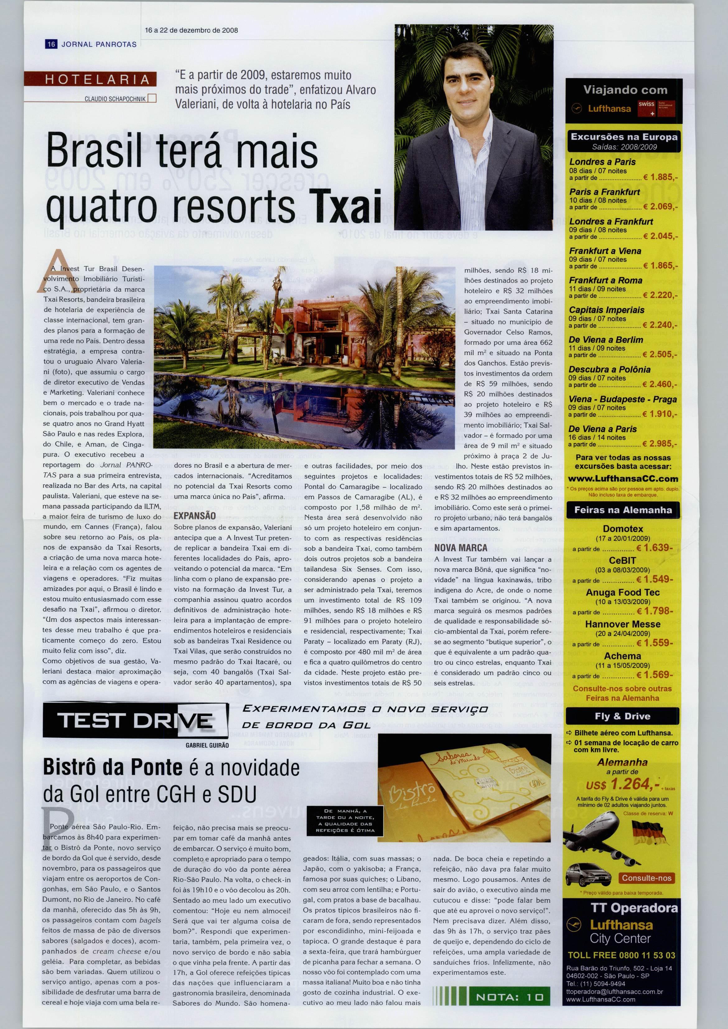 vantagens para toda a cadeia do turismo. Bonadona também sedizpegodesurpresacomaposiçãodaAbavNacional. "Aentidadeparticipoudomovimentoeseupresidente esteveem algumas dasreuniões",afirmou,oqueoFohb comprova com a apresentação da carta que convoca -via e-mail endereçado ao presid^ite Kaká-aentidadease juntar às demais -ABIH,ABQev,TMC, Favecc, SindettJr, eao próprioFohb-naformulaçãodeapoioconjuntoàmedida. Assim como arespostadeKaká, agradecendo oconvitee comunicando suaimpossibilidadedecomparecer. Igualmente surpreso sedisseopresidentedoFavecc, Francisco LemedaSilva. "Estamos apenas cumprindo a determinaçãodoprópriopresidenteda Abav, queno ijltimo congresso nacionaldaentidade propôs aos associados uma reflexãosobreotema:"Osnegócios mudaram, evocê?Nós acreditamos na mudança". Eestamosfazendoa nossa parte", disse Francisco Leme.O presidente daAbav-SP, Edmar Buli ;V; - embora neste evento representando o Favecc - não se isentou de manifestar seu apioio ao fim do faturamento. "É o f. fim do risco para as agências de viagens, especialmente as | pequenas, quese tomarão mais competitivas no mercado", i cc^Iui. (Fátima Gatoeiro) |