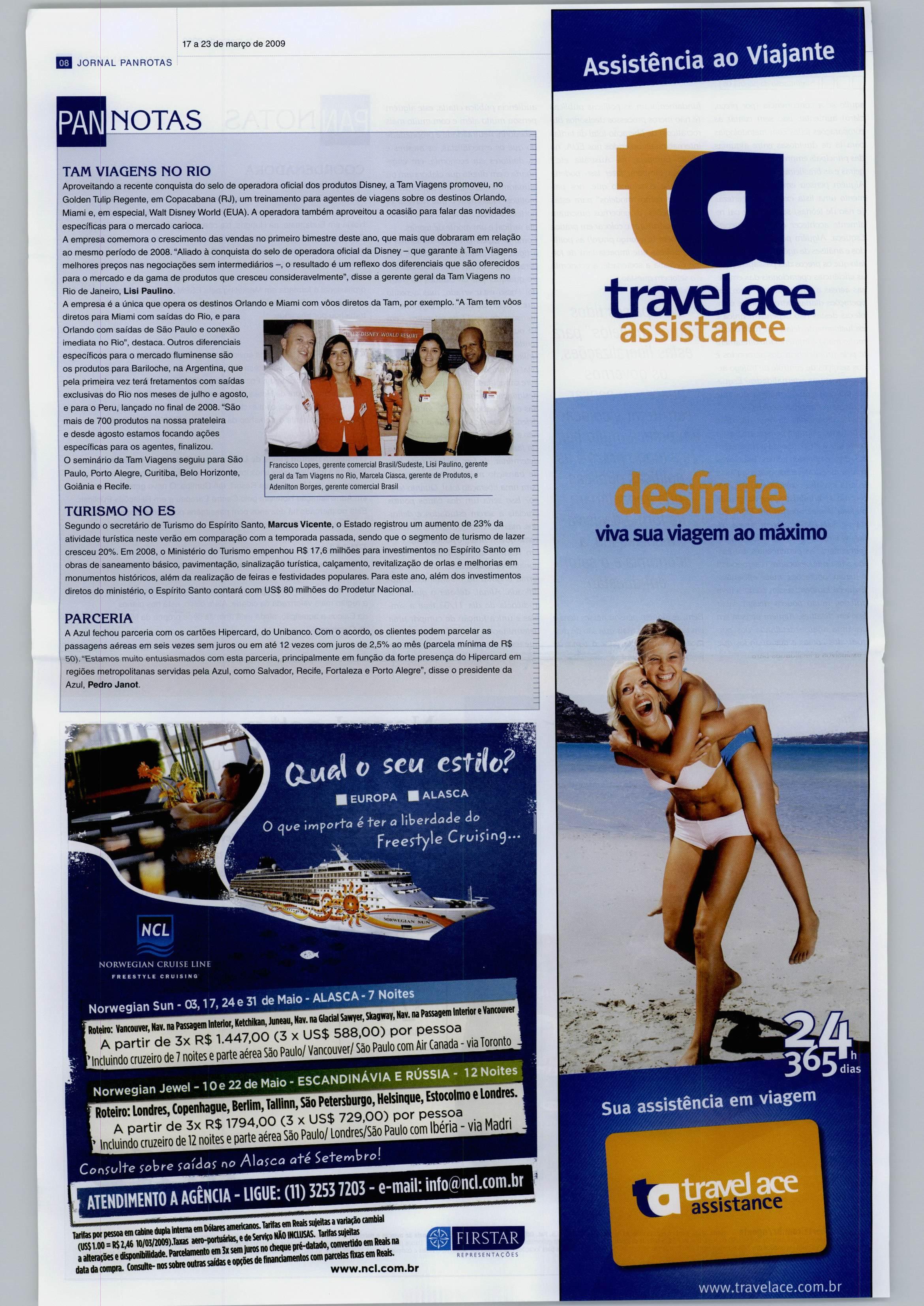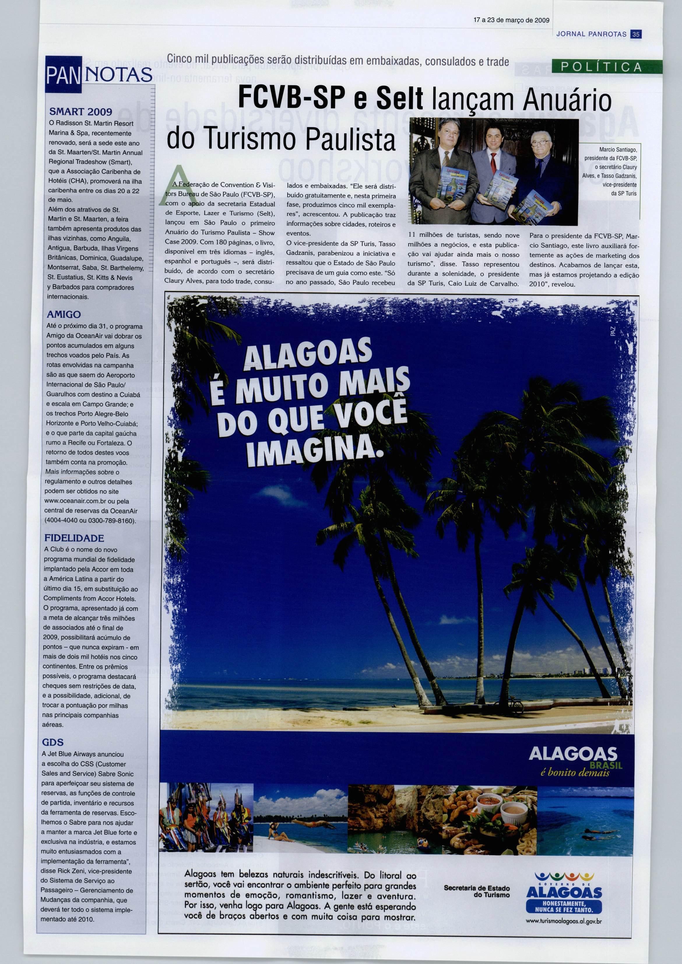 em eventos, que tenha como mis são apenas desenvolver o turismo, o que, atualmente, significaria traçar um plano de "ajuda para combater a crise". Parênteses para recomendar, nessa edição recheada de números e dicas, a coluna de Jeanine Pires, na página 48. Nota dez, com louvor. Que os debates do sétimo Fórum PANROTAS gerem caminhos para que o turismo brasileiro saia fortaleci do desta crise, que as promessas se jam cumpridas, as opiniões respeita das, as diferenças aproximadas e as tendências cada vez mais positivas. Só depende de nós.