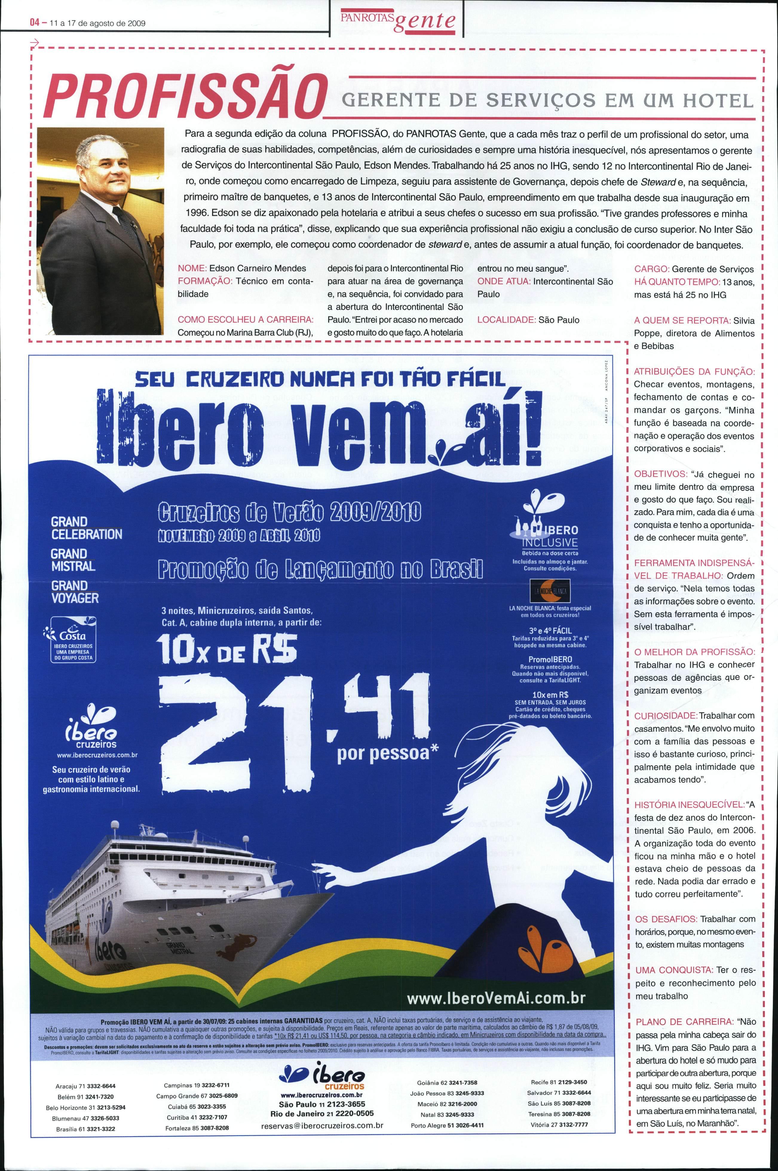 Para a segunda edição da coluna PROFISSÃO, do PANROTAS Gente, queacadamês traz o perfil de um profissional do setor, uma radiografia de suas habilidades, competências,alémdecuriosidadesesempreuma história inesquecível,nós apresentamos ogerente de Serviços do Intercontinental São Paulo, Edson Mendes. Trabalhando há25 anos noIHG, sendo 12no Intercontinental Riode Janei ro, ondecomeçoucomoencarregadode Limpeza, seguiupara assistente deGovernança,depoischefede Stewarde, naseqüência, primeiro maítredebanquetes,e 13 anosde Intercontinental SãoPaulo,empreendimentoemquetrabalha desde sua inauguraçãoem 1996. Edson se dizapaixonadopelahotelariae atribui a seus chefes o sucesso em sua profissão.'Tive grandes professores eminha faculdade foi toda naprática", disse, explicando que sua experiência profissionalnãoexigiua conclusão de curso superior.No Inter São Paulo,porexemplo,ele começou como coordenador de stewarde, antes de assumir aatualfunção, foi coordenador de banquetes.
