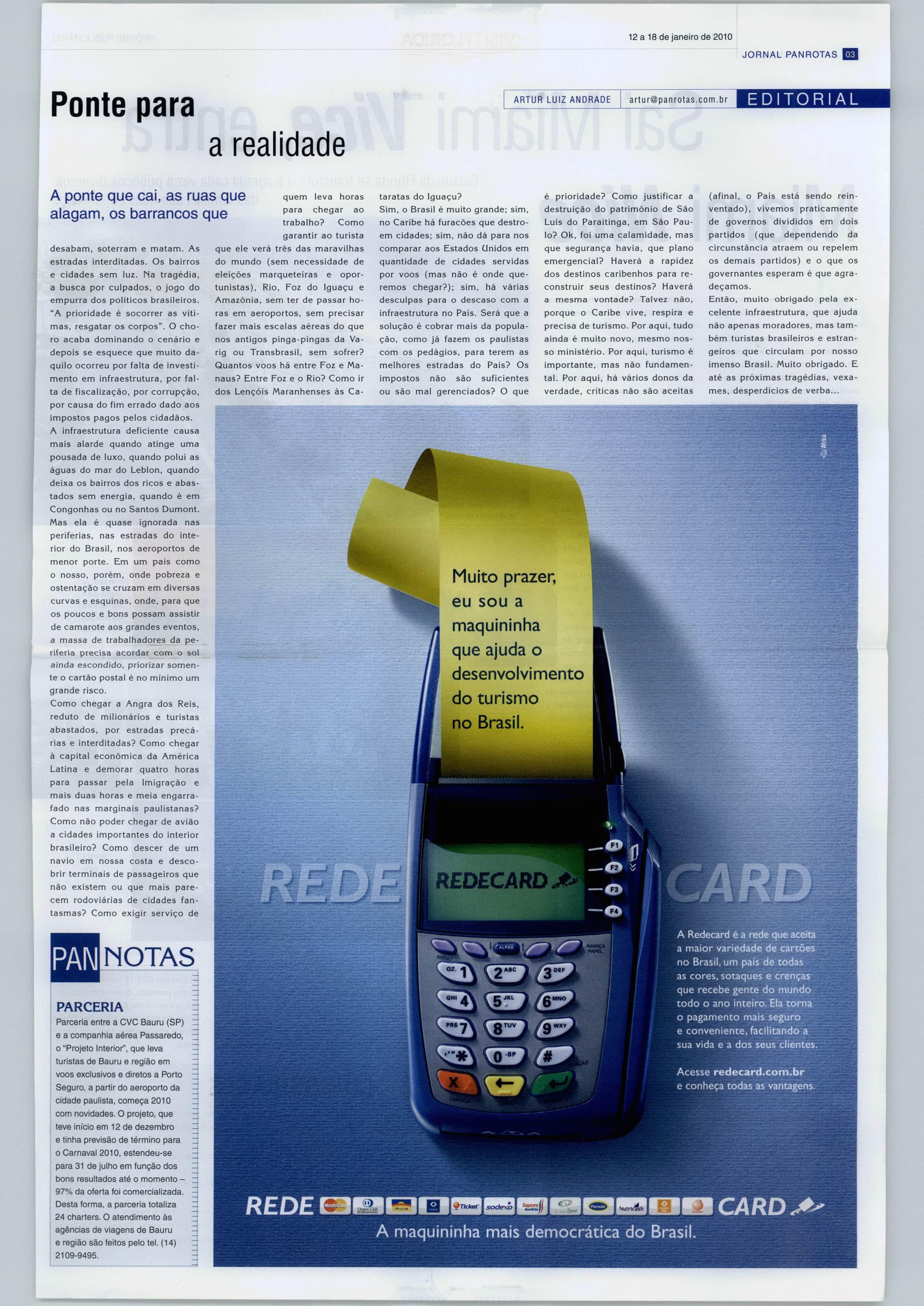 A infraestrutura deficiente causa mais alarde quando atinge uma pousada de luxo, quando polui as águas do mar do Leblon, quando deixa os bairros dos ricos e abas tados sem energia, quando é em Congonhas ou no Santos Dumont. Mas ela é quase ignorada nas periferias, nas estradas do inte rior do Brasil, nos aeroportos de menor porte. Em um país como o nosso, porém, onde pobreza e ostentação se cruzam em diversas curvas e esquinas, onde, para que os poucos e bons possam assistir de camarote aos grandes eventos, a massa de trabalhadores da pe riferia precisa acordar com o sol ainda escondido, priorizar somen te o cartão postal é no mínimo um grande risco.