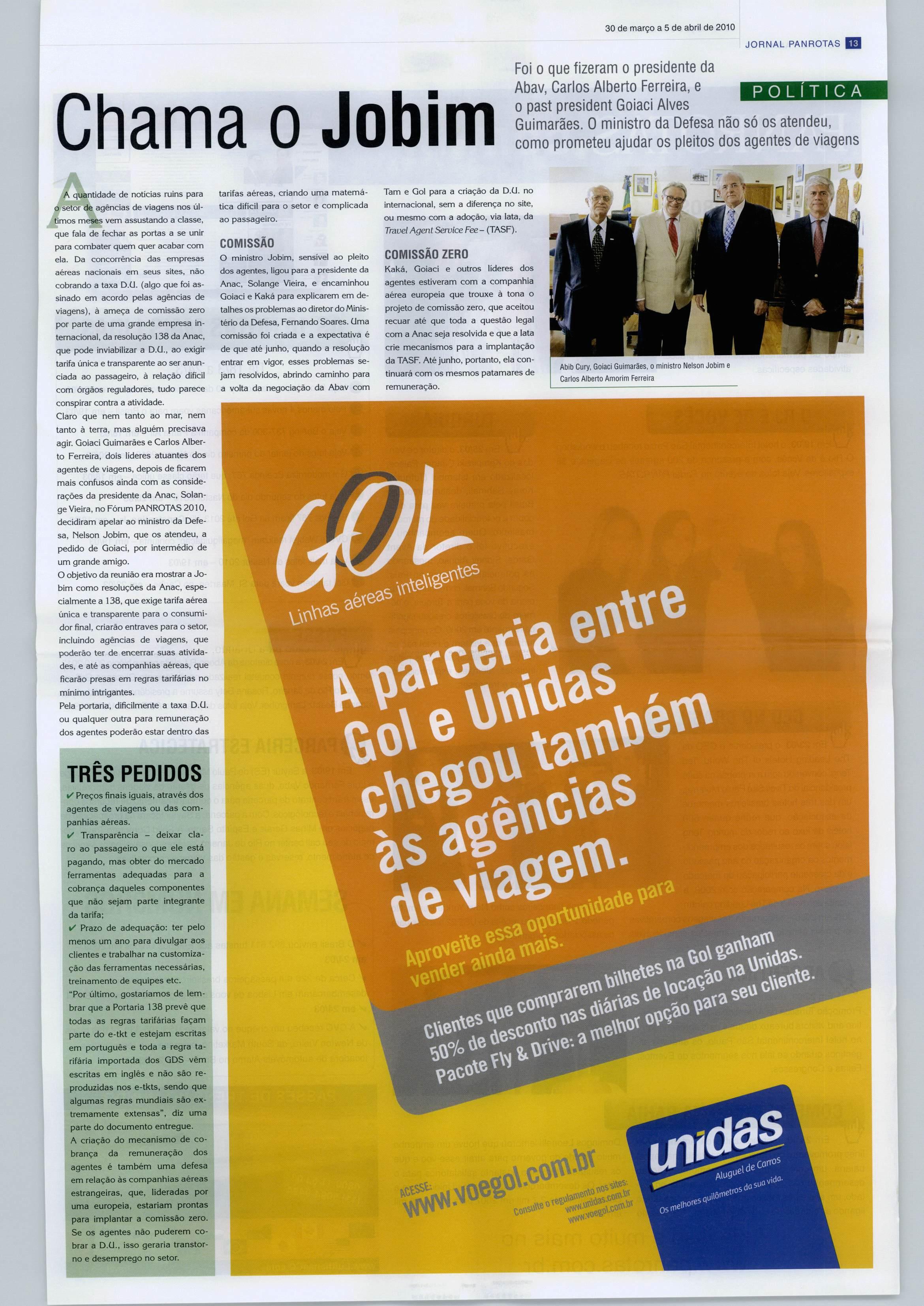 esperaram a boa vontade dos santos e foram direto em quem manda. O ministro Nelson Jobim os recebeu e reagiu: colocou a equipe para en fim ouvir os agentes de viagens, te lefonou para a presidente da Anac, iniciou o processo. E ainda con seguiram segurar a comissão zero anunciada, na moita, sem alarde, por uma empresa aérea europeia. A resposta das entidades edo trade assustou a companhia, que viu que o diálogo ainda éa solução. E que há diversas variáveis em uma negociação, além de circunstâncias de mercado que, no caso, foram ne-