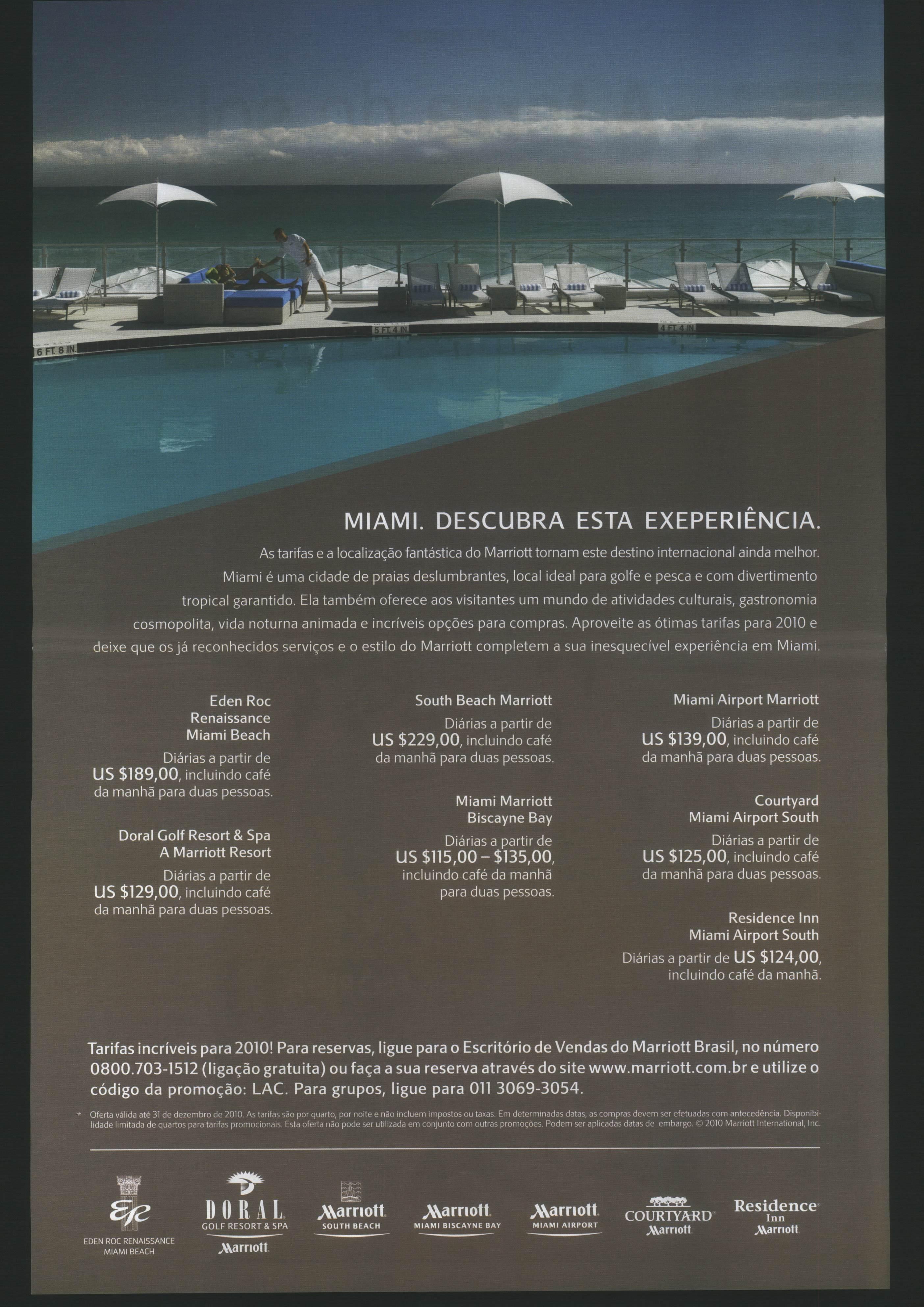 Miami éuma cidade depraias deslumbrantes, localidealparagolfee pesca ecom divertimento tropicalgarantido. Ela também oferece aosvisitantesum mundo deatividadesculturais,gastronomia cosmopolita,vidanoturna animada eincríveis opções para compras. Aproveiteasótimastarifaspara2010e deixe que osjá reconhecidos serviços eoestilodoMarriott completem asua inesquecível experiência em Miami.