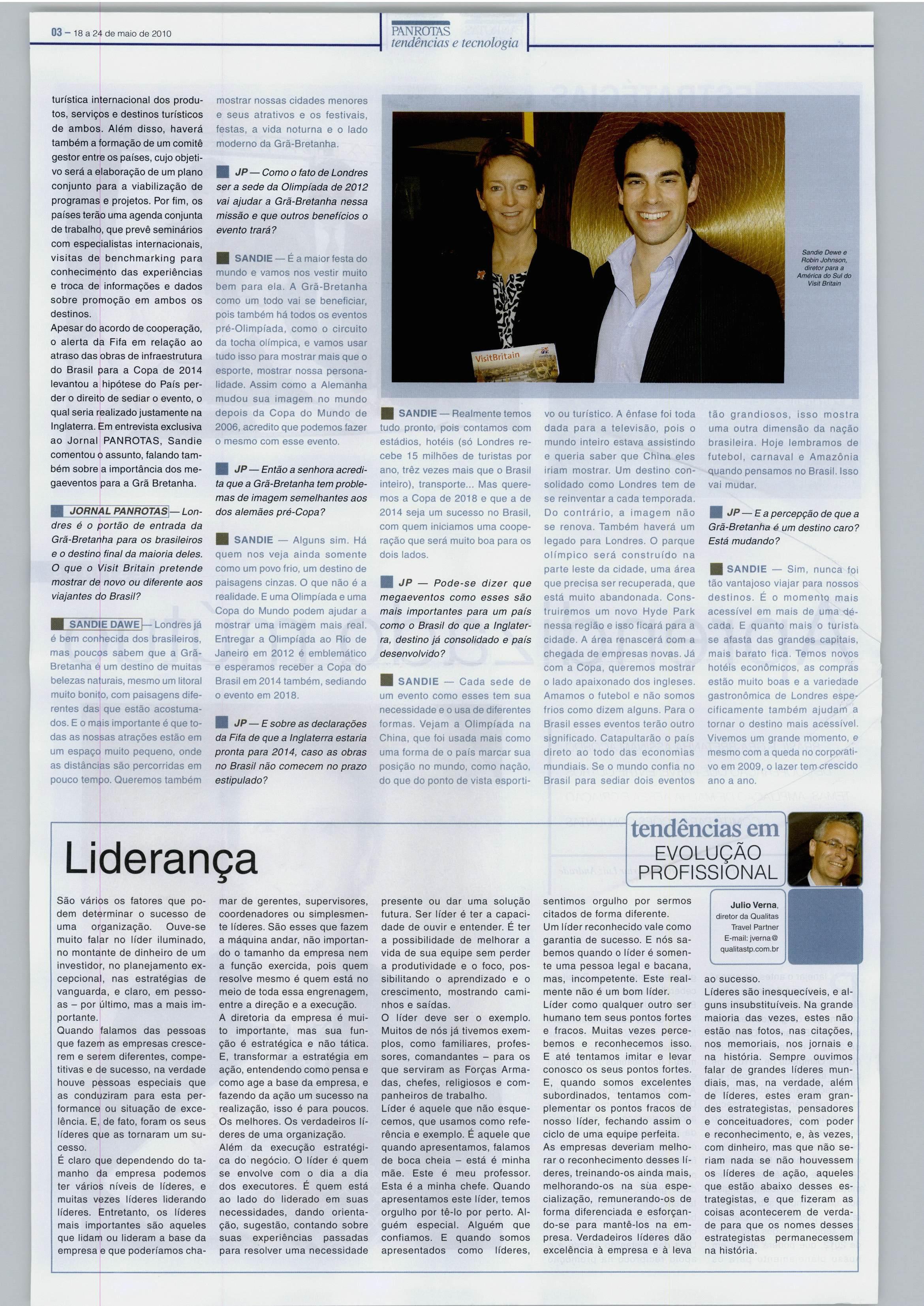 m SANDiE Sim, nunca foi tão vantajoso viajar para nossos destinos. Éo momento mais acessível em mais de uma <lécada. E quanto mais o turista, se afasta das grandes capitais, mais barato fica, Temos novos hotéis econômicos, as compras estão muito boas ea variedade gastronômica de Londres espe cificamente também ajudam a tornar o destino mais acessível. Vivemos um grande momento, e mesmo com a queda no corporati vo em 2009, o lazer tem crescido ano a ano.