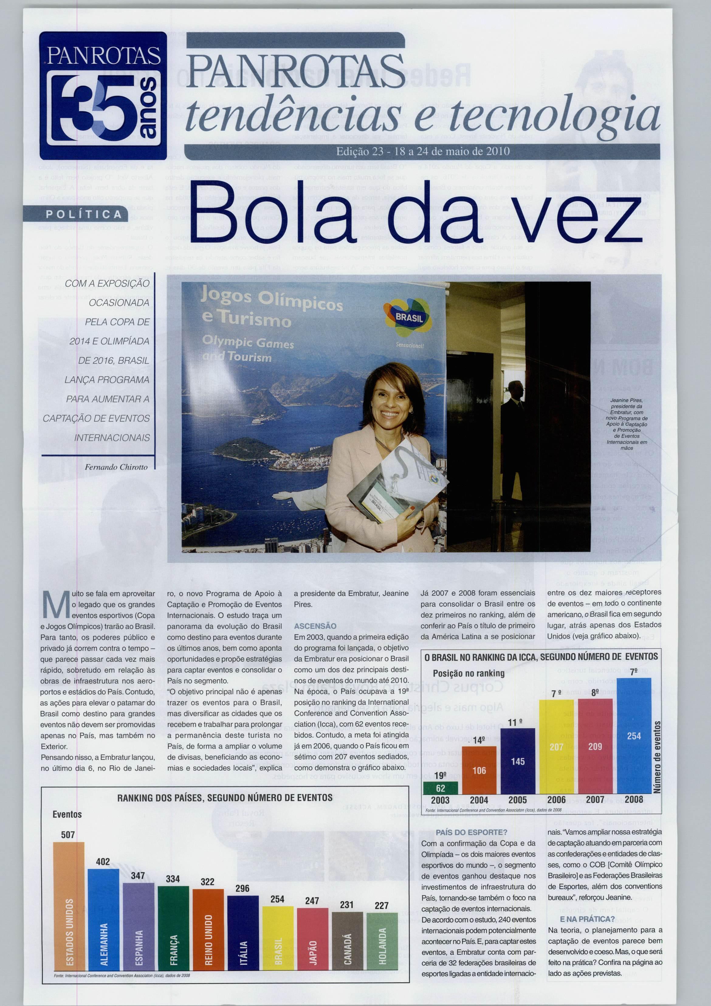 ro,o novo Programa de Apoio à Captação e Promoção de Eventos Internacionais. O estudo traça um panorama da evolução do Brasil como destino para eventos durante os últimos anos, bem como aponta oportunidades e propõe estratégias para captar eventos e consolidar o País no segmento. "Oobjetivoprincipal não é apenas trazer os eventos para o Brasil, mas diversificar as cidades que os recebem e trabalhar para prolongar a permanência deste turista no País, de forma a ampliar o volume de divisas, beneficiando as econo mias e sociedades locais", explica